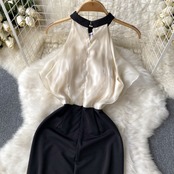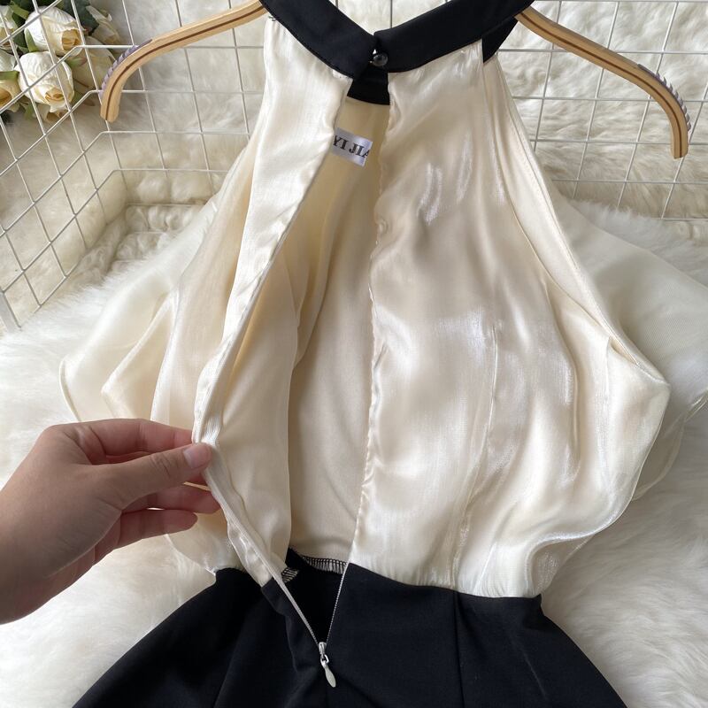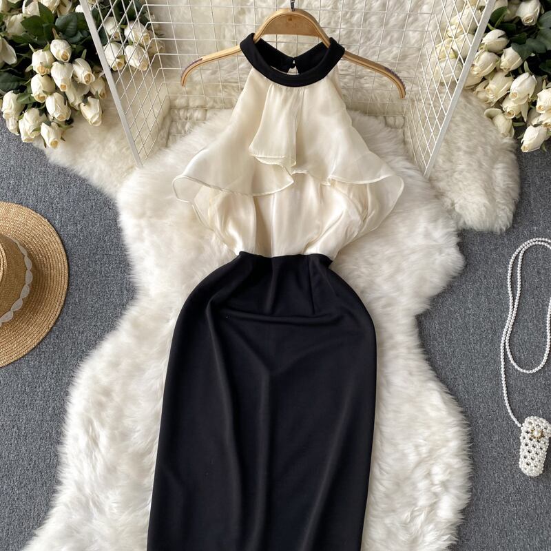 夏の新しいスタイルのハイエンド オーガンザ スプライシング ホルター ネック スタイル スリム フィットお尻のイブニング ドレスの女性ドレス スカート サマー 夏物 lyxaj32413120108