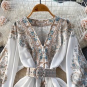 春の新スタイルフレンチレトロプリントシングルブレストVネックランタンスリーブウエストミッドレングススモールドレストレンディ スプリング 春物 lyxaj11391150461