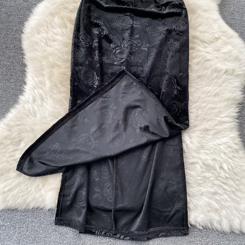 2022 秋の新ベルベットライトおなじみのスタイルレトロ黒スリット気質パールセクシーなバッグヒップチャイナドレス ブラック オータム 秋物 真珠 lyxaj5320922978