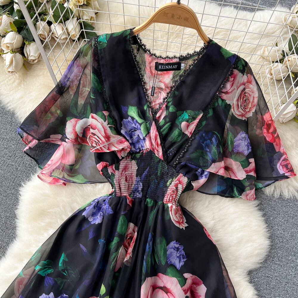 夏の V ネック プリント シフォン ドレス女性のウエスト ウエスト表示薄い気質フリル半袖ウエスト初恋の妖精のドレス サマー 夏物 Vネック lyxaj93949914653