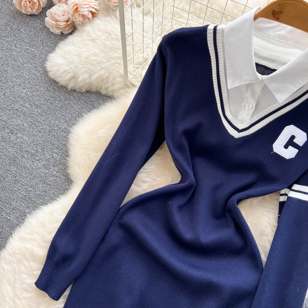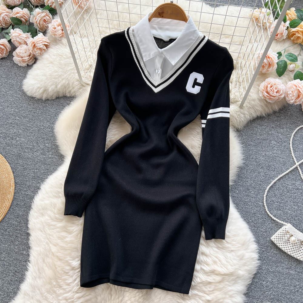 春と秋の新しいカレッジスタイルのフェイクツーピーススプライシング薄いポロカラーヒップセクシーなニットシャツドレス スプリング 春物 オータム 秋物 lyxaj31302312334