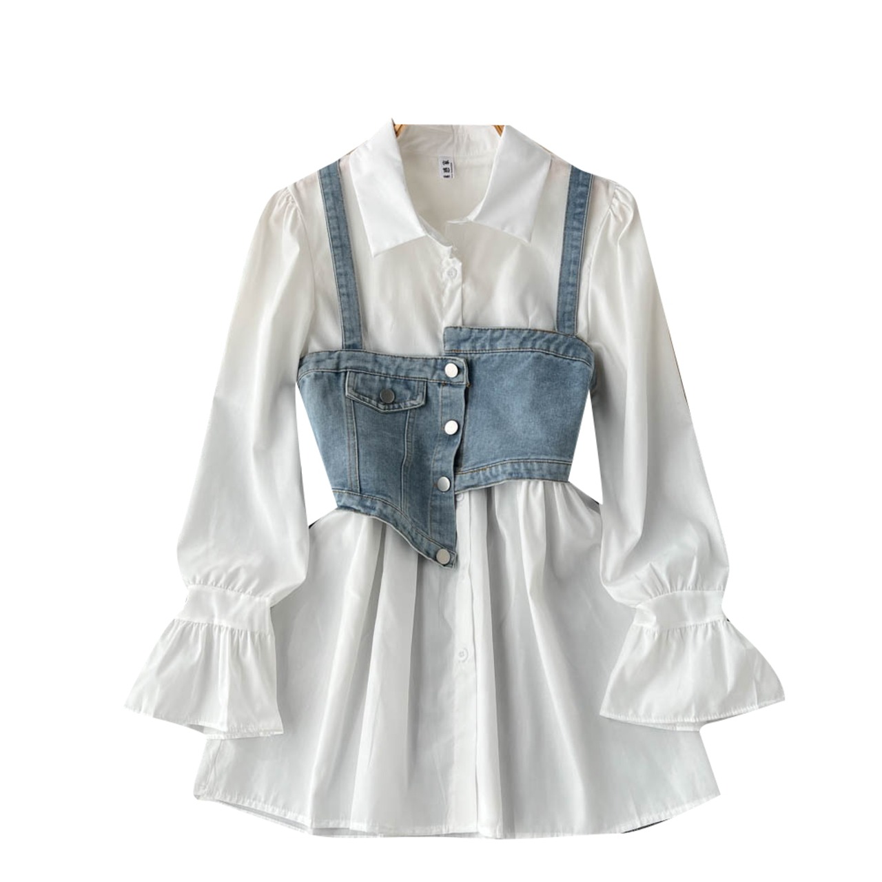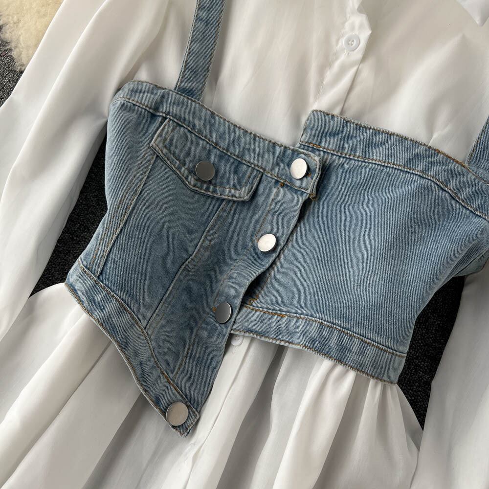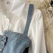 デニム イレギュラー スモール サスペンダー 上品 気質 トランペットスリーブ シャツドレス スカート 秋 レディース ツーピースセット オータム 秋物 lyxaj37450742913