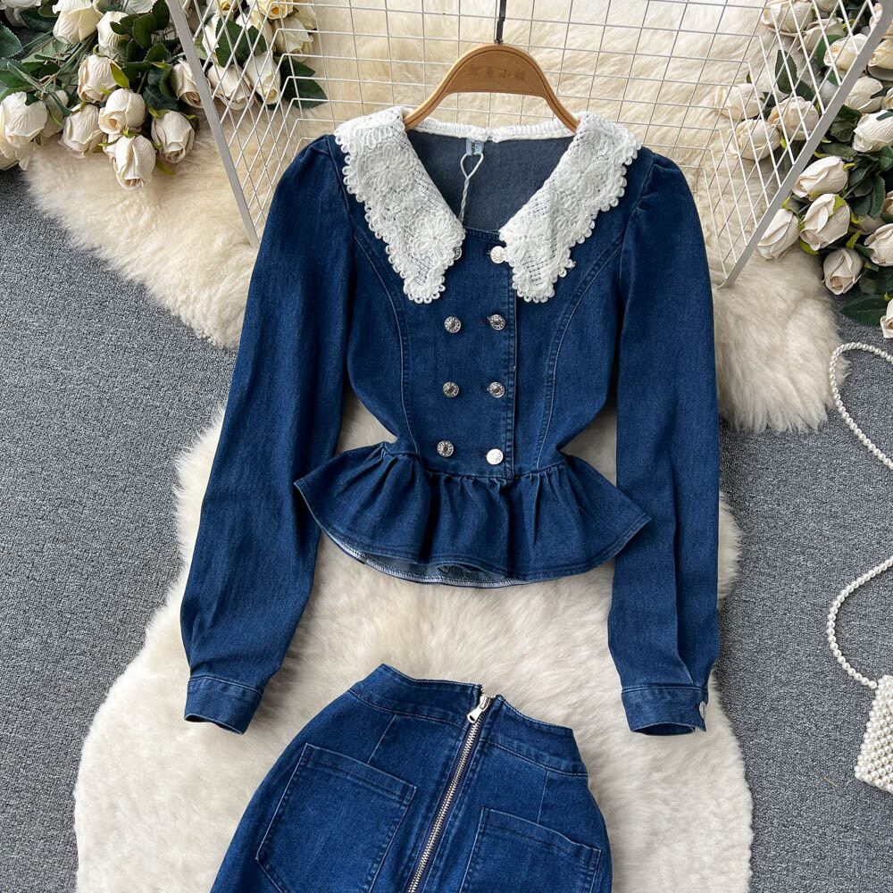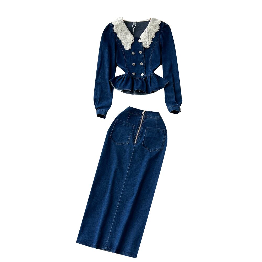 春の新作レトロスーツレディースレースドールカラーデニムジャケット+ミドル丈ヒップスカート2点セット スプリング 春物 lyxaj15122872502