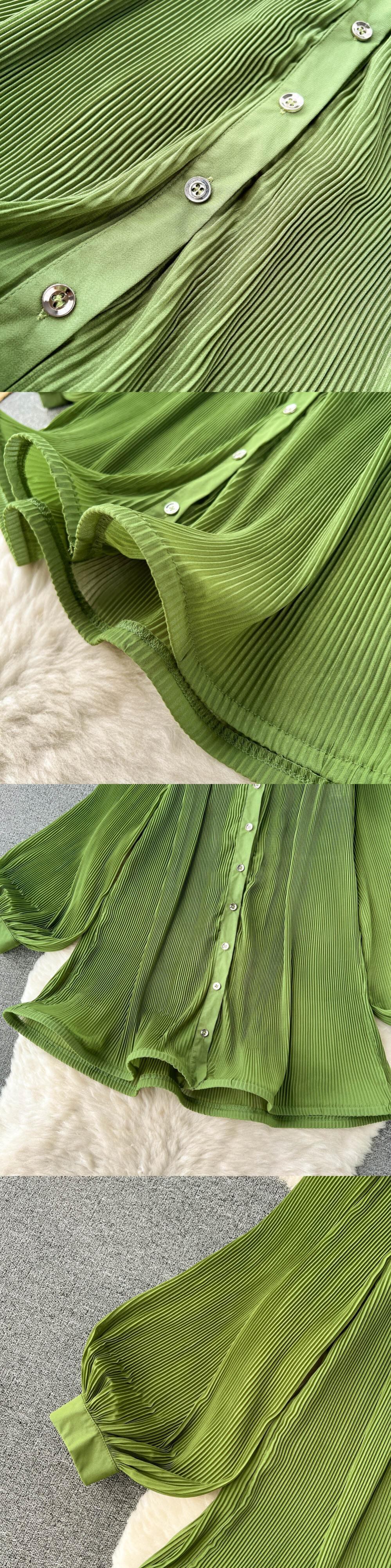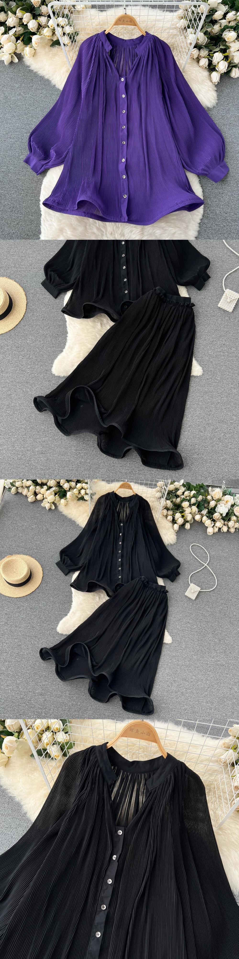 欧米風ウェーブエッジスーツ ランタンスリーブVネックシングルルーズシャツ+ミドル丈プリーツスカートの2点セット ヨーロピアン lyxaj68405289688