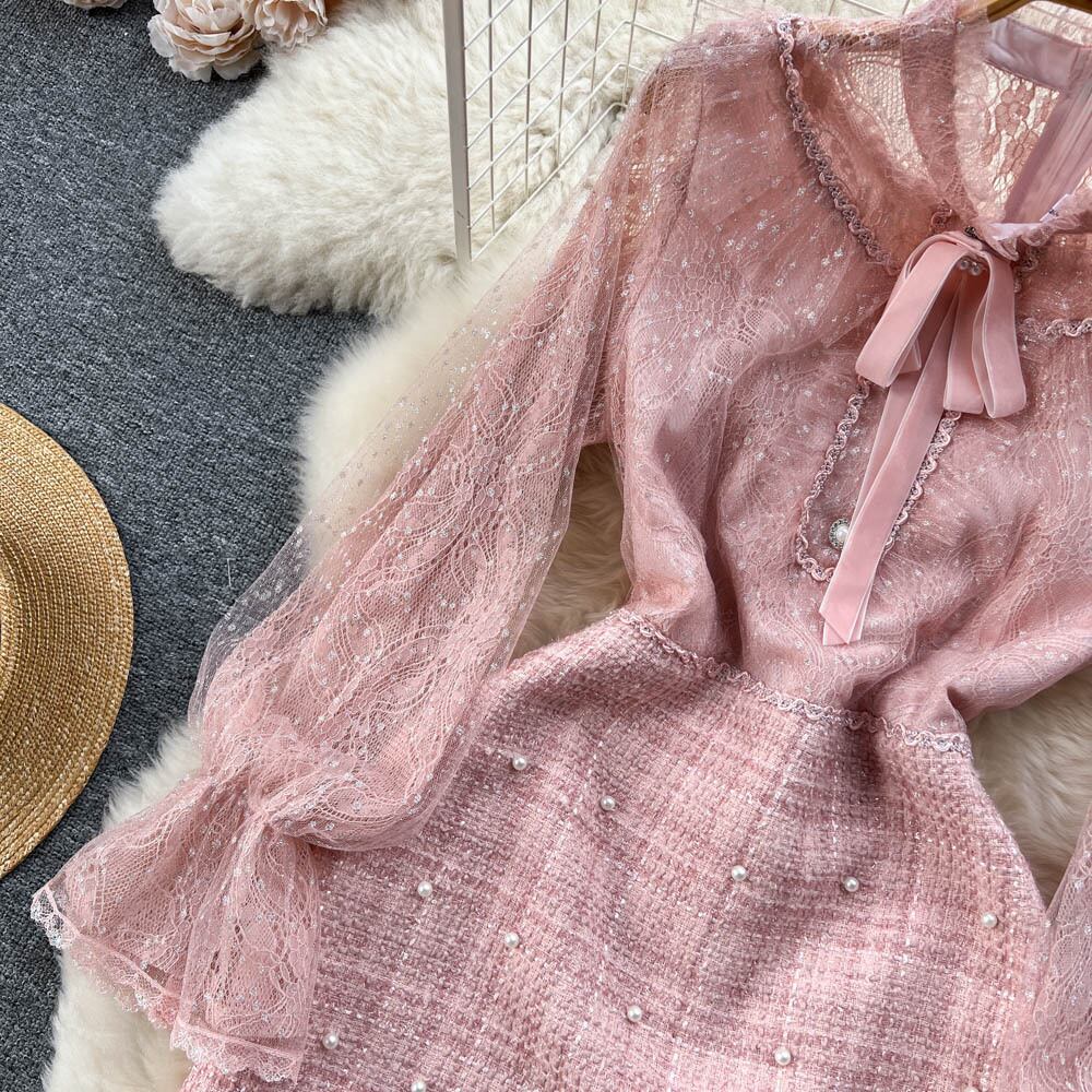 春と秋の新しいピンク重工業ビーズ レース ステッチ フレンチ スタイル小さな香りライト高級プリンセス気質ドレス潮 スプリング 春物 オータム 秋物 lyxaj70017323821