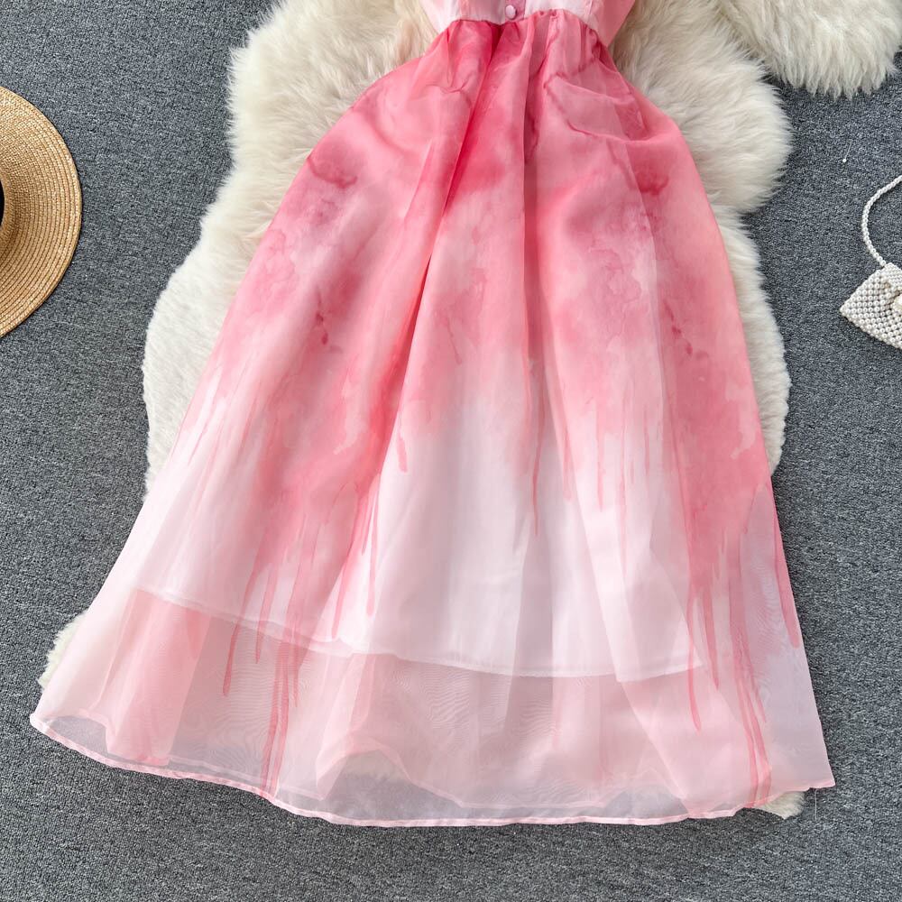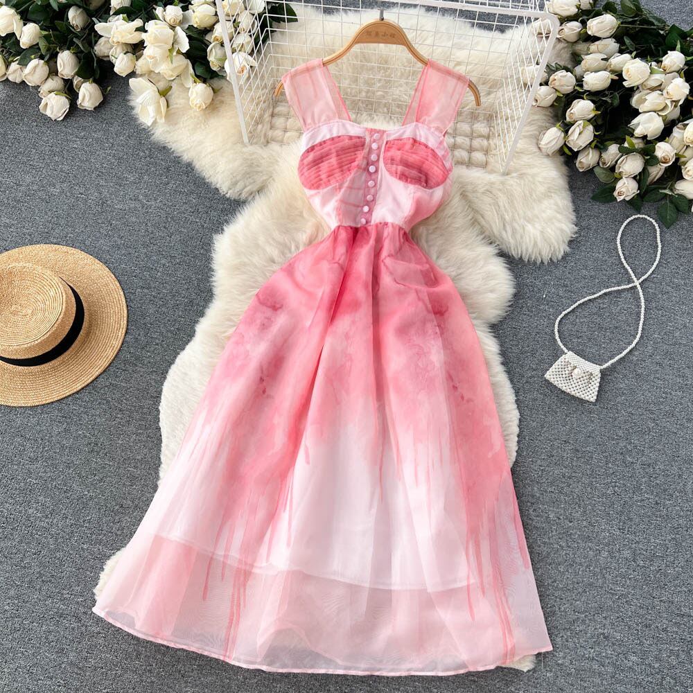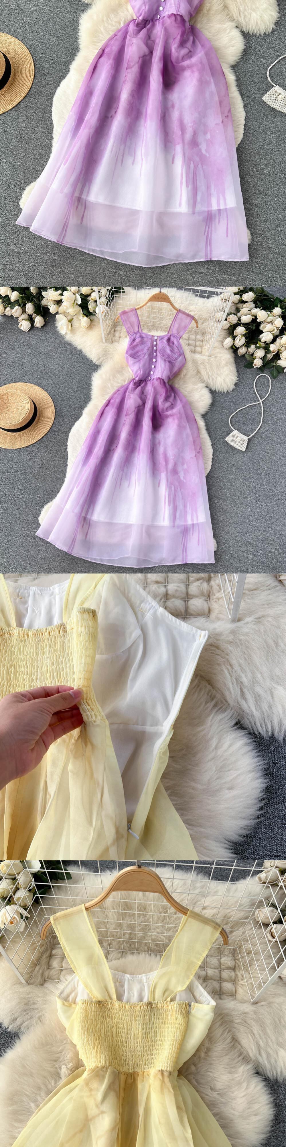 フランスの初恋サスペンダードレス女性の夏の新しいミッドレングス eign スタイルグラデーション絞り染め妖精 A ラインのプリンセスドレス サマー 夏物 Aライン lyxaj30044882780