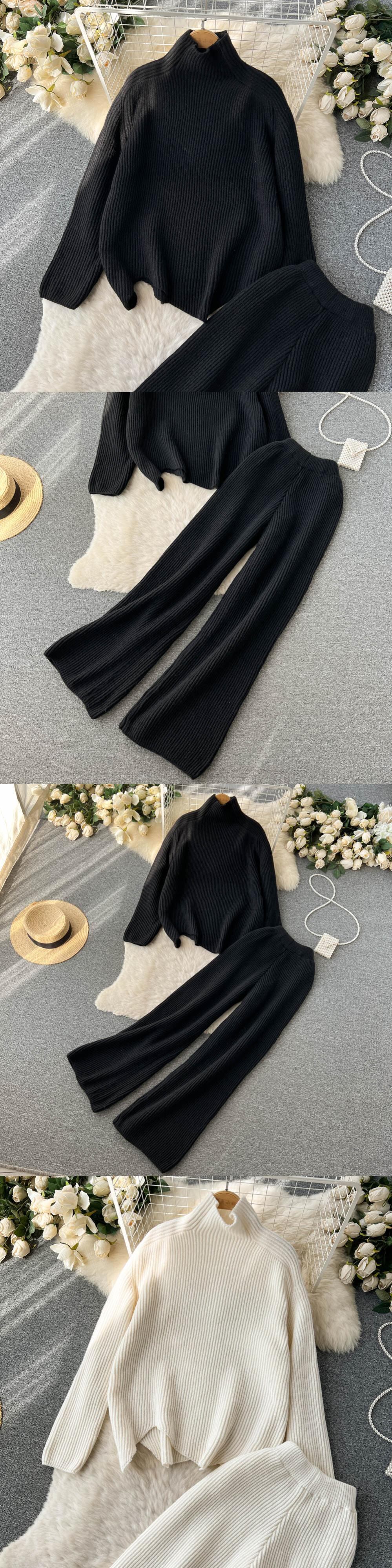 秋冬気質の淑女風ニットスーツ女性不規則タートルネックセーター+カジュアルワイドレッグロングパンツ2点セット オータム 秋物 ウィンター 冬物 lyxaj3675714972