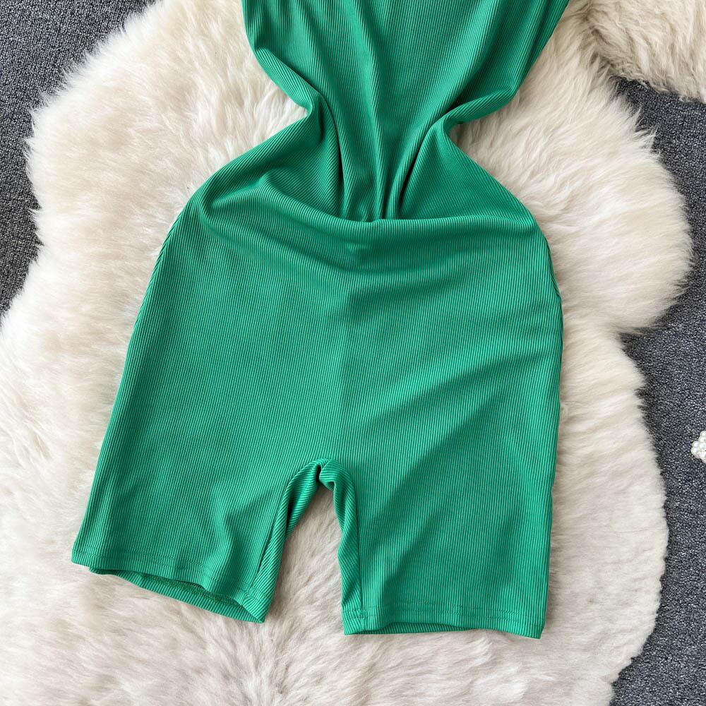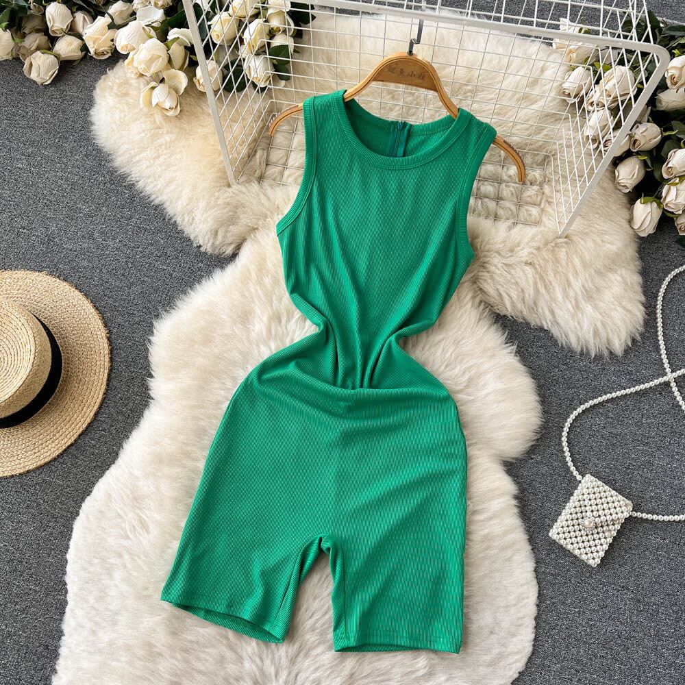 ウエスト細め ノースリーブ ベスト ワンピース パンツ 夏 レディース グリーン ストレート スリム ショートパンツ トレンドイン サマー 夏物 ショーツ ブルマー lyxaj49654351098