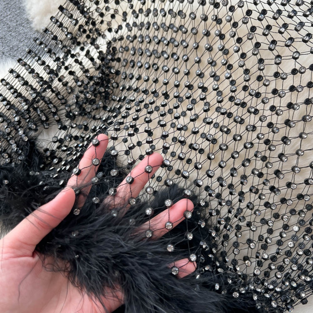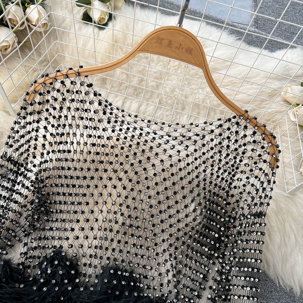 毛むくじゃらスプライシング重工業ビーズラウンドネックトップレディーストランペットロングスリーブショートヨーロッパとアメリカのインウィンドトップトレンド Oネック ヨーロピアン lyxaj25726215114