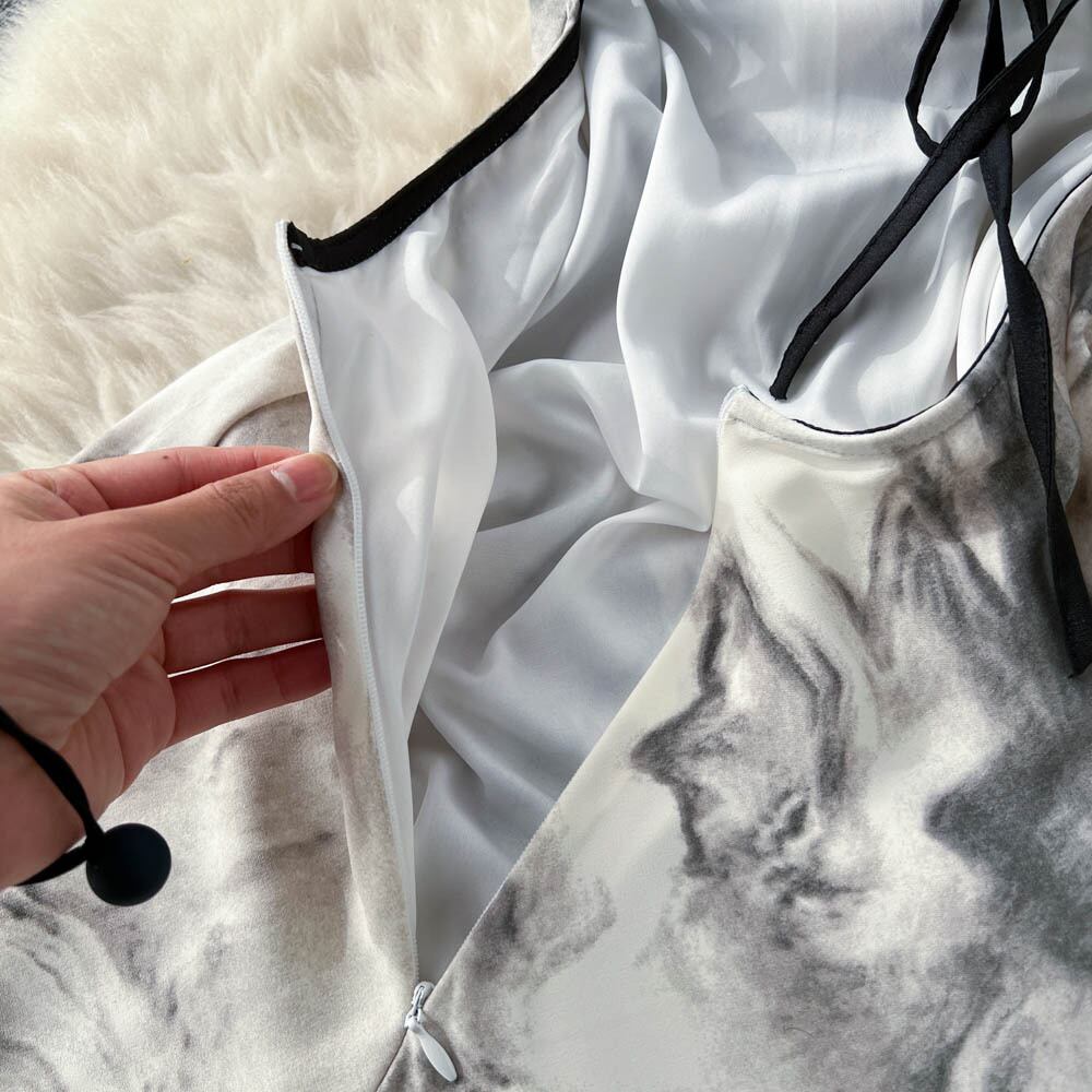 春と夏の新しい水墨画の新しい中国風のスイングカラーサスペンダー背中の開いた気質ドレス女性のウエストフィッシュテールバッグヒップドレス スプリング 春物 サマー 夏物 lyxaj88996769296
