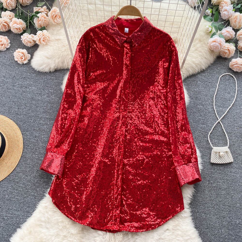 フランスのニッチ ライト ラグジュアリー スパンコール ファッショナブルな長袖シャツ レディース デザイン センス 気質 ラペル シングルブレスト ボタン ルーズ トップ 潮 ロング lyxaj14670942990