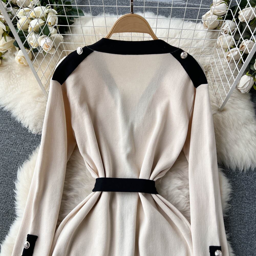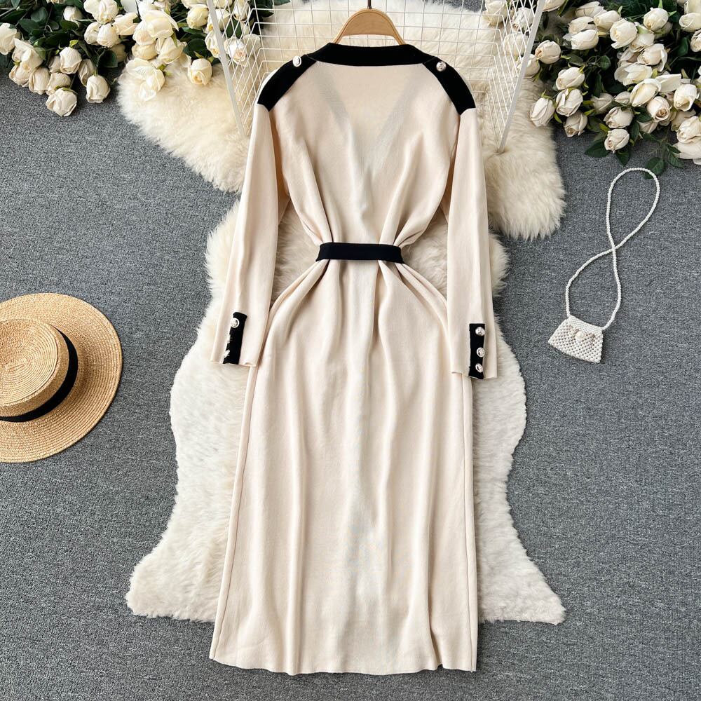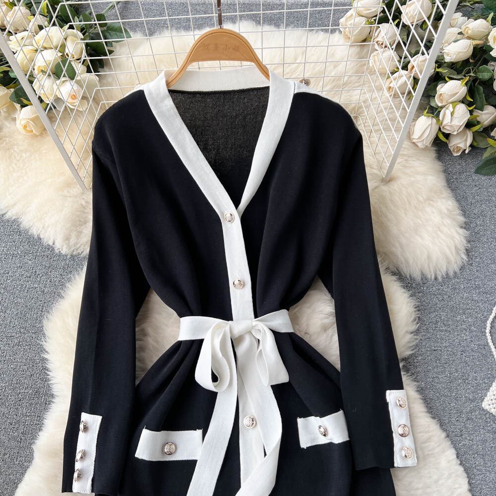 サウスの新作深いVネックデザインの配色のコントラストがユニークなシングルブレストのストラップウエストの純粋な欲望のニットワンピース ピュア lyxaj4046676506