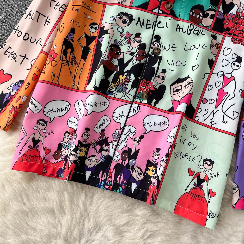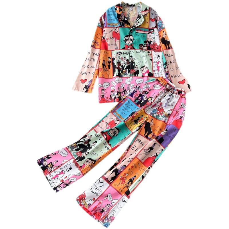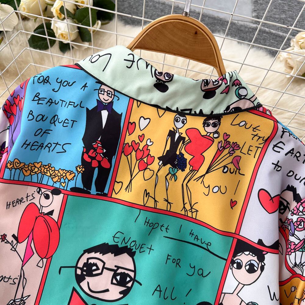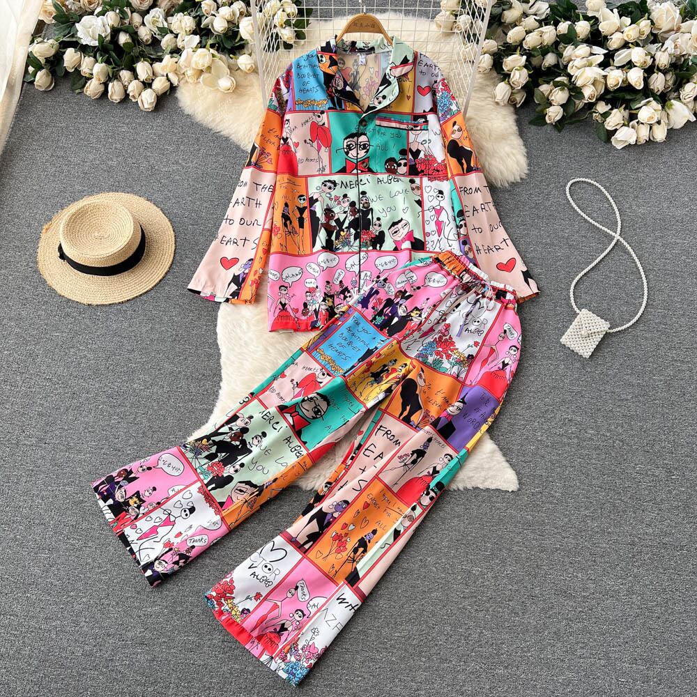シックなファッションスーツ女性の夏のフライドストリートスーパーファイヤーグラフィティプリントルーズ長袖シャツ弾性ウエストワイドレッグパンツ ロング エラスティック 伸縮 サマー 夏物 lyxaj7226091514