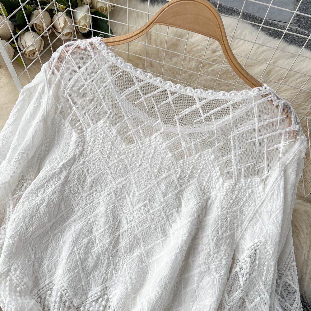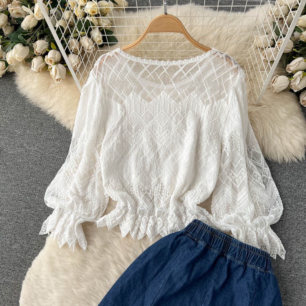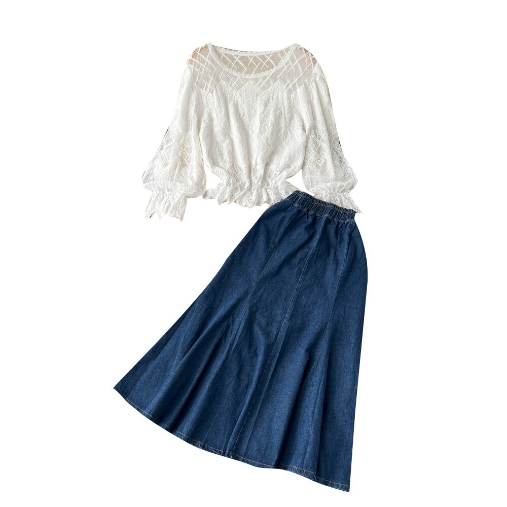春フレンチファッションパフスリーブかぎ針編みレースシャツハイウエストスイングミッドレングスデニムスカートツーピーススーツ ハイウェスト スプリング 春物 lyxaj32967473699