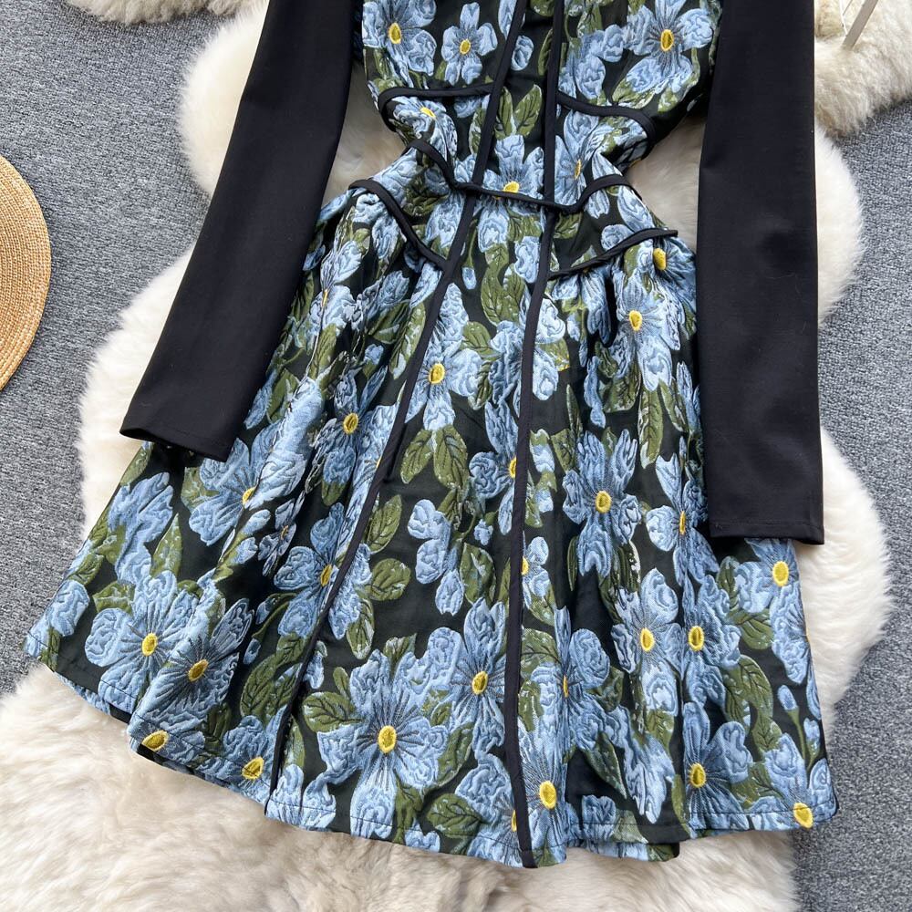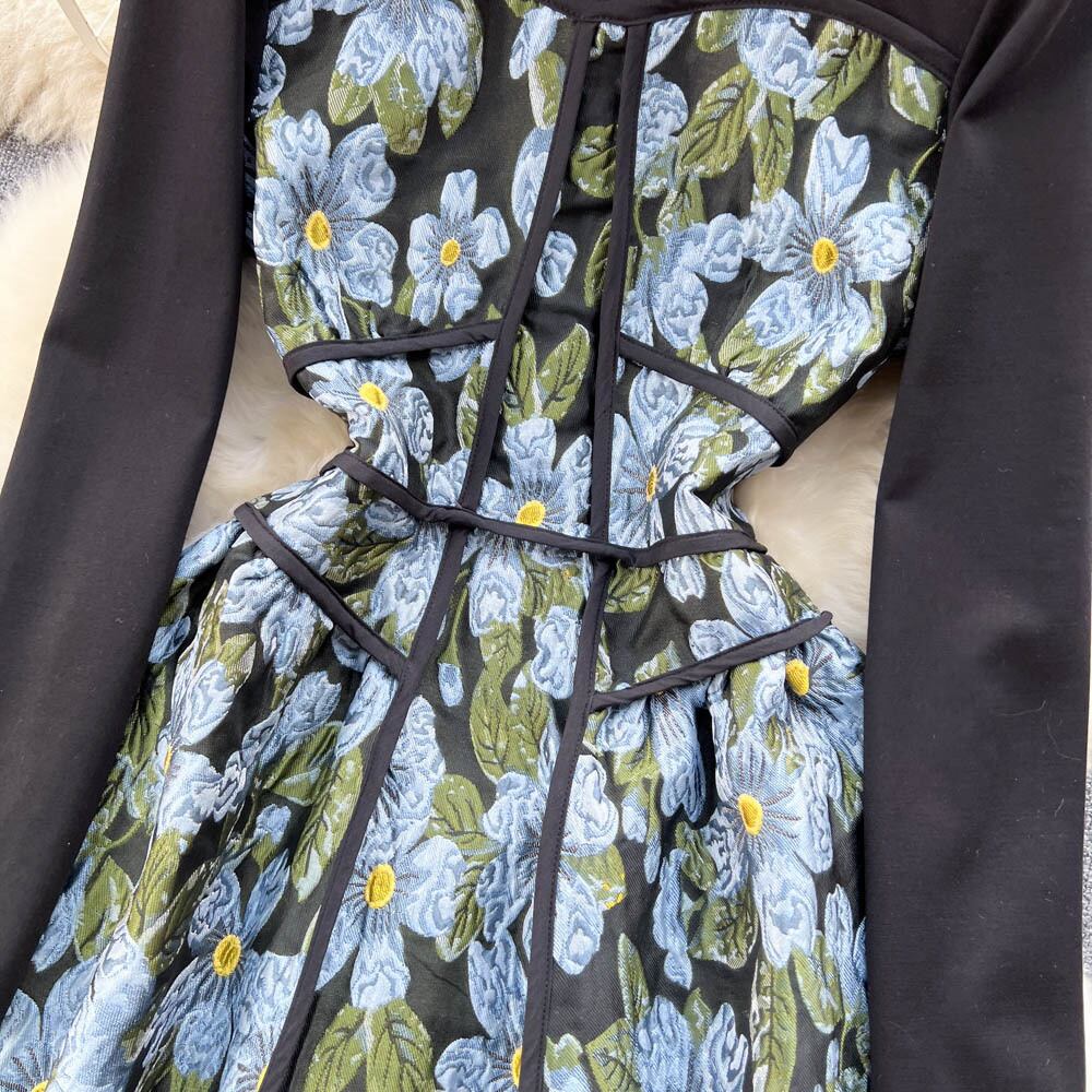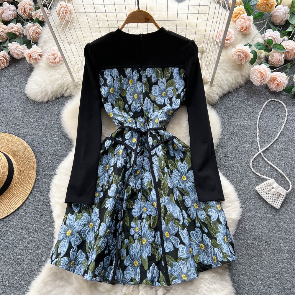 2023 春の新ハイエンドジャカードドレスの女性のヨーロッパとアメリカのレトロな長袖ラウンドネックスプライシング A ラインスカートトレンディ ロング スプリング 春物 Oネック Aライン ヨーロピアン lyxaj92693250680