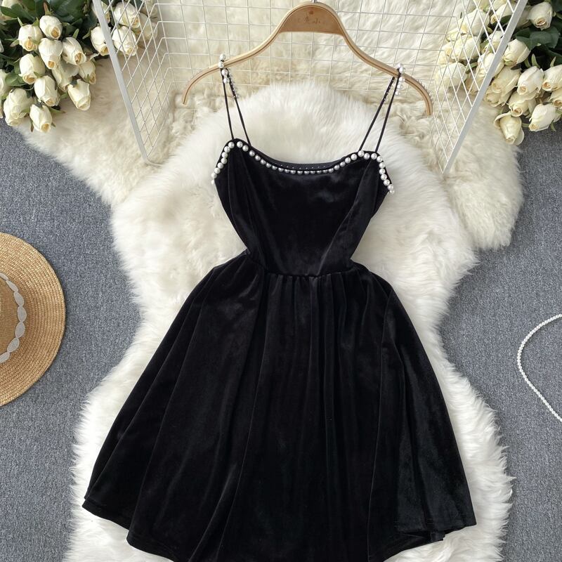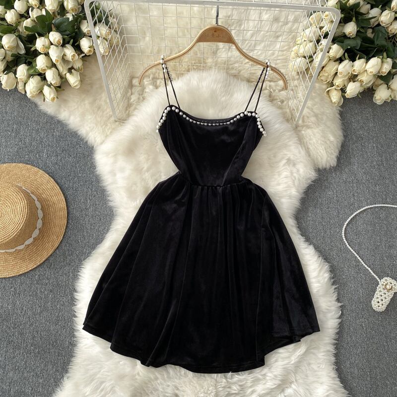 秋の新デザインセンス小さなドレススカート女性パールスリング気質ハイエンドふわふわベルベットドレススカート オータム 秋物 真珠 lyxaj64458519025
