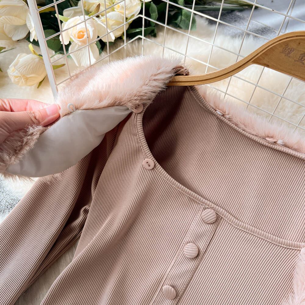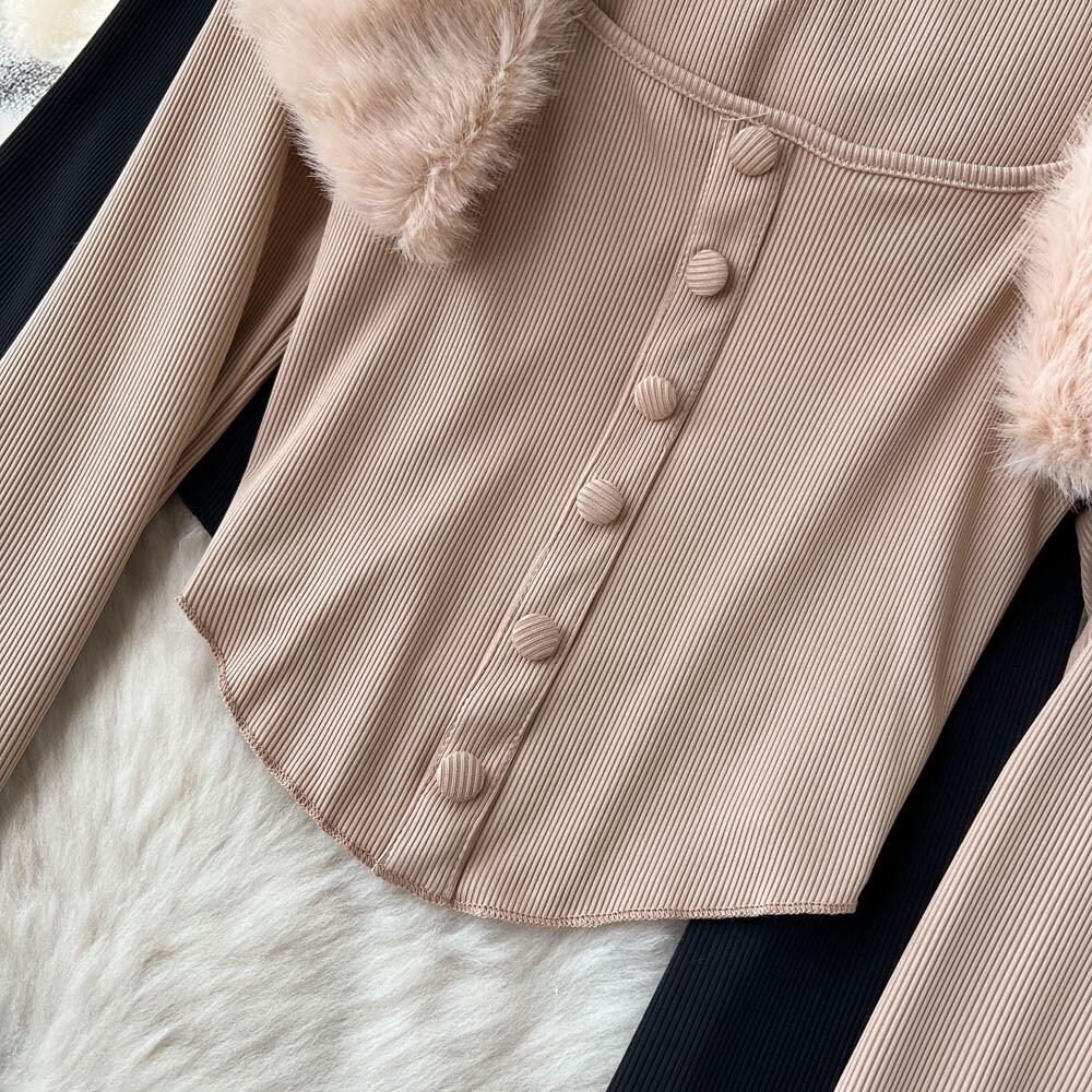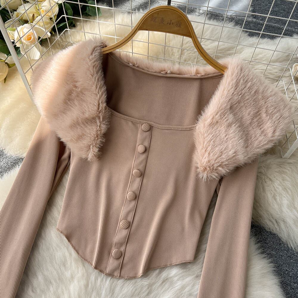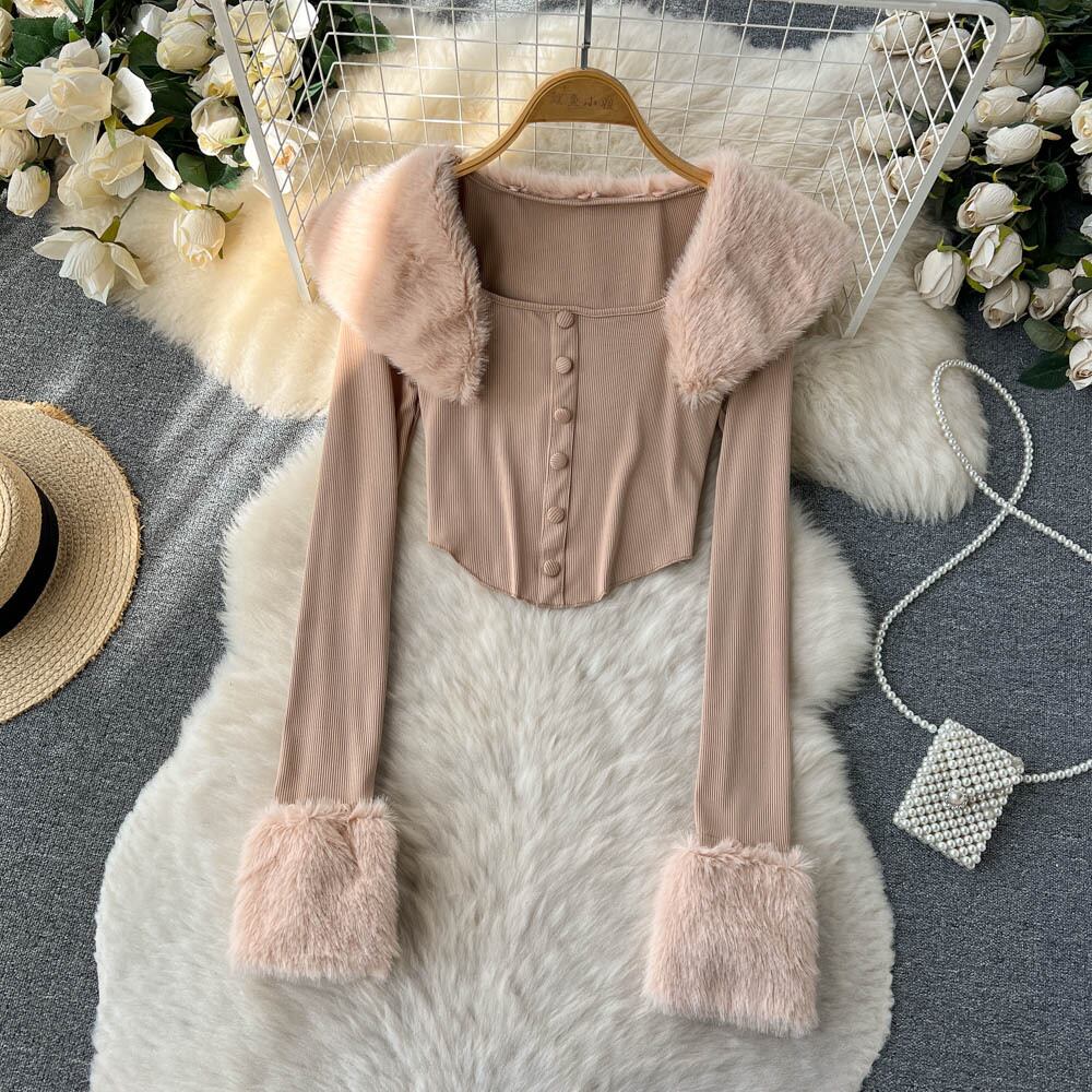 秋と冬の豪華な毛皮の襟スプライシング スクエア カラー ショート ニット セーター女性の純粋な欲望スタイル ショート長袖ベイビー ボトミング トップ ロング オータム 秋物 ウィンター 冬物 ピュア スクウェア lyxaj61542964855