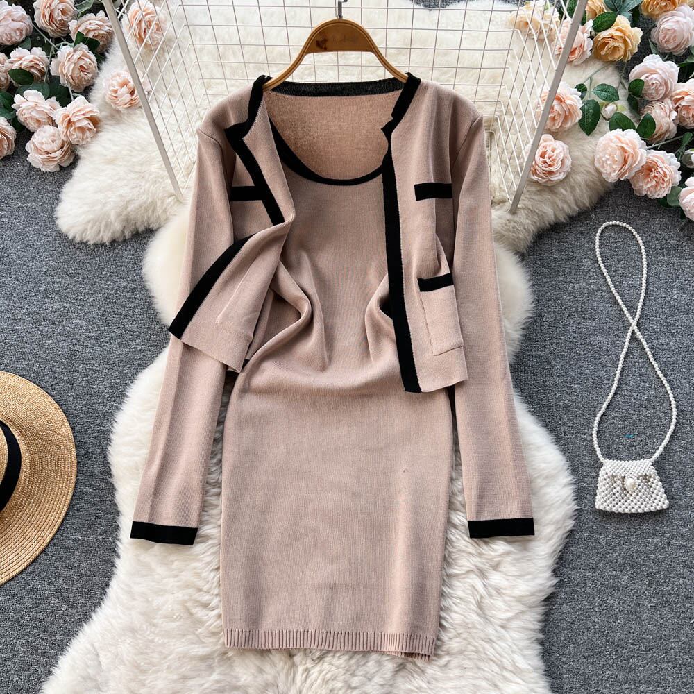 春の新作スモールフレグランスカラーコントラストスーツレディースニットショールカーディガン+ヒップストラップドレスツーピーストレンディ スプリング 春物 lyxaj15130338900