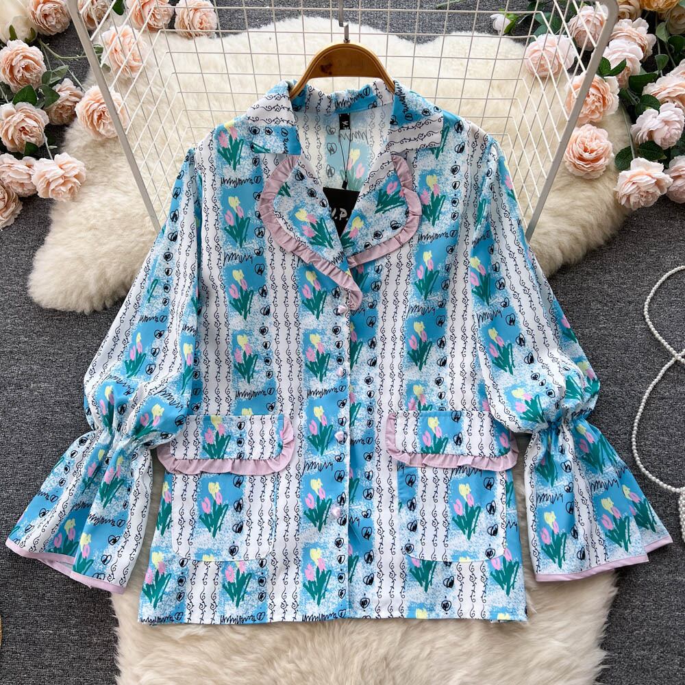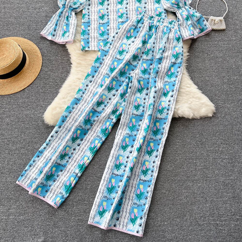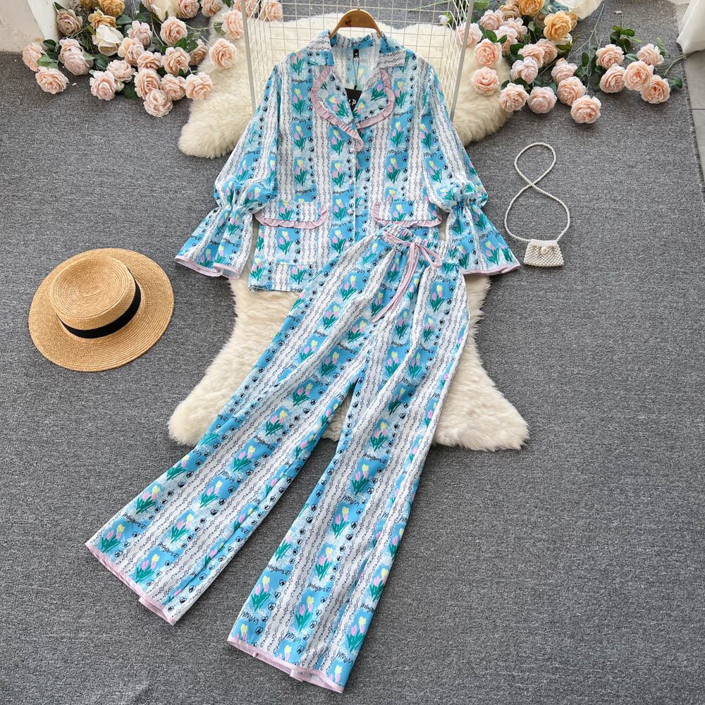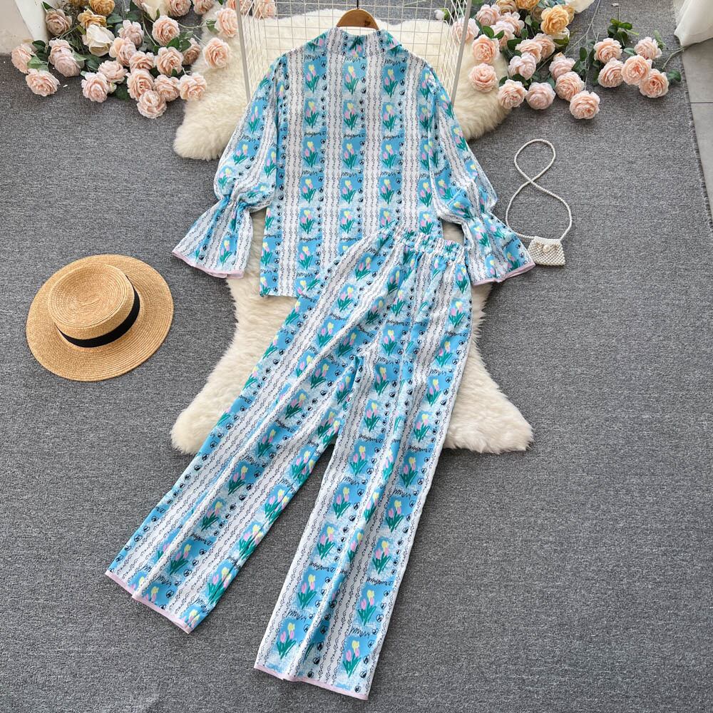 有能洋風トレンディなツーピーススーツ女性の秋プリントトランペットスリーブシャツトップハイウエストルーズワイドレッグパンツ ハイウェスト オータム 秋物 lyxaj10033626059