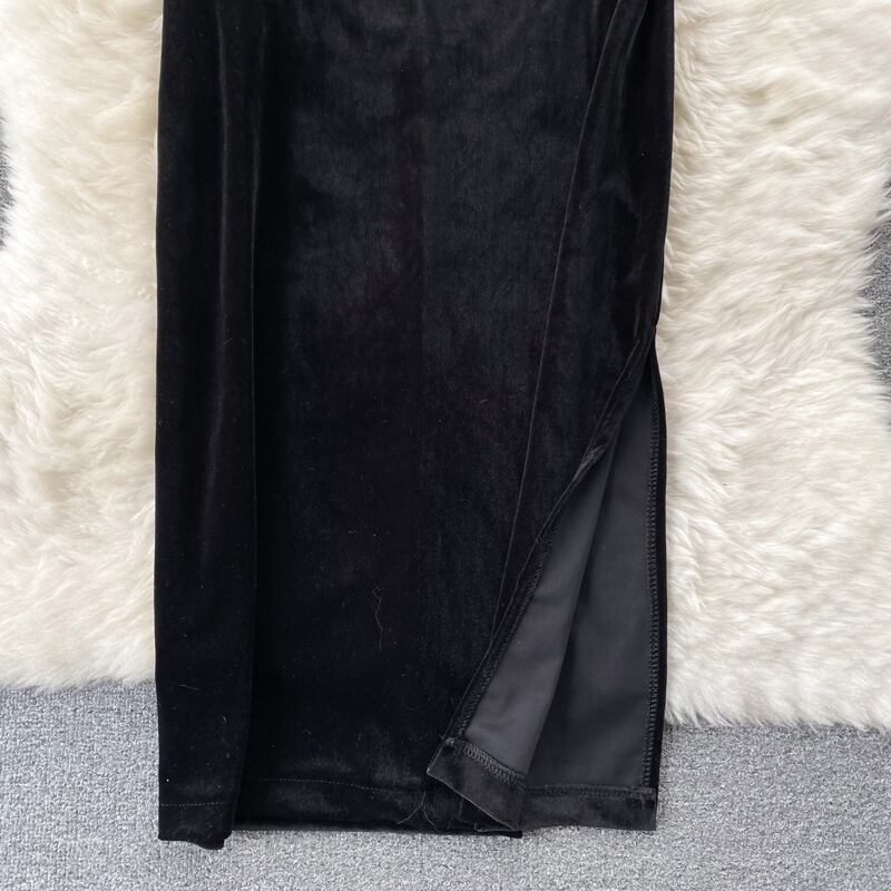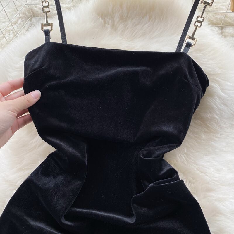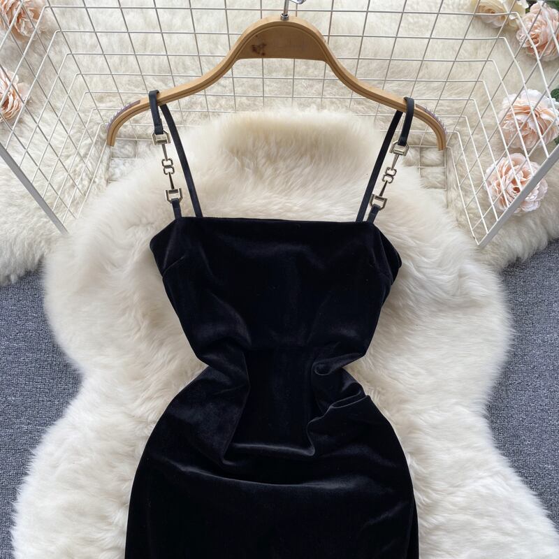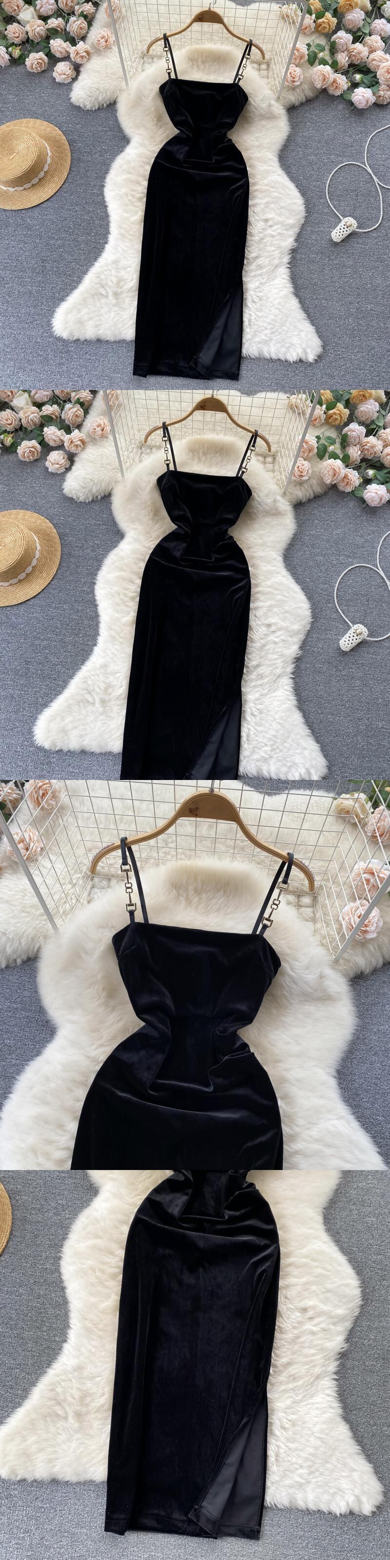 ゴールド ベルベット サスペンダー スリット ドレス女性の 2022 秋の新フレンチ スタイル気質ウエスト インナー底入れリトル ブラック ドレス オータム 秋物 lyxaj78877205641
