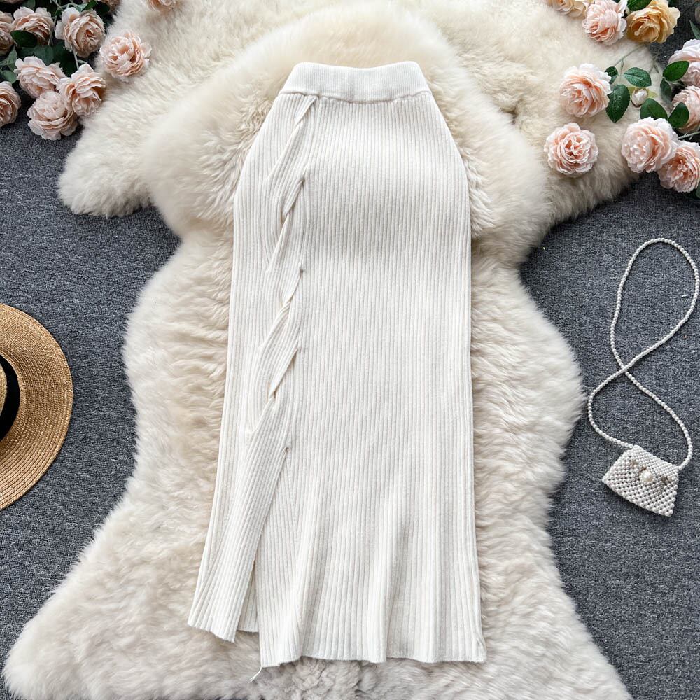 秋冬の新気質ハイウエストデザインセンスツイスト中空スリットストレートチューブバッグヒップデザインセンスニットスカート ハイウェスト オータム 秋物 ウィンター 冬物 lyxaj78113105239