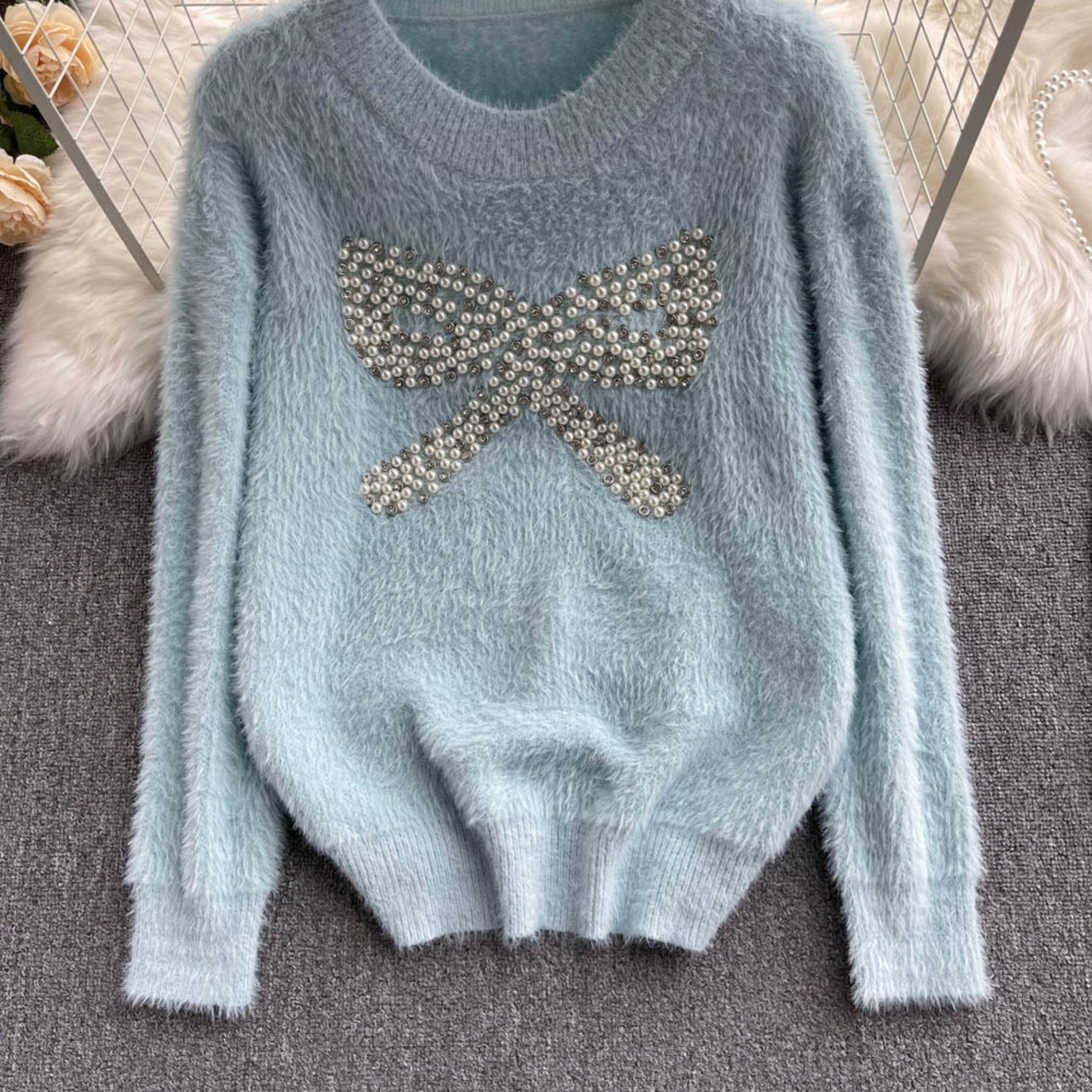 甘い年齢を減らす重工業のビーズのモヘアのセーターのトップの女性の緩い怠惰な気質のオールマッチのデザインセンスのセーター 大人ガーリー スウィート キュート カジュアル lyxaj78230159857