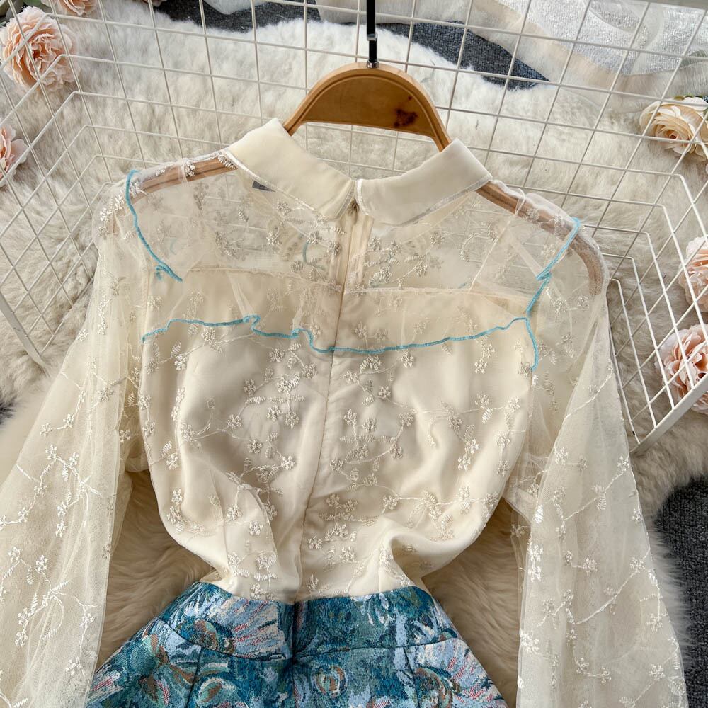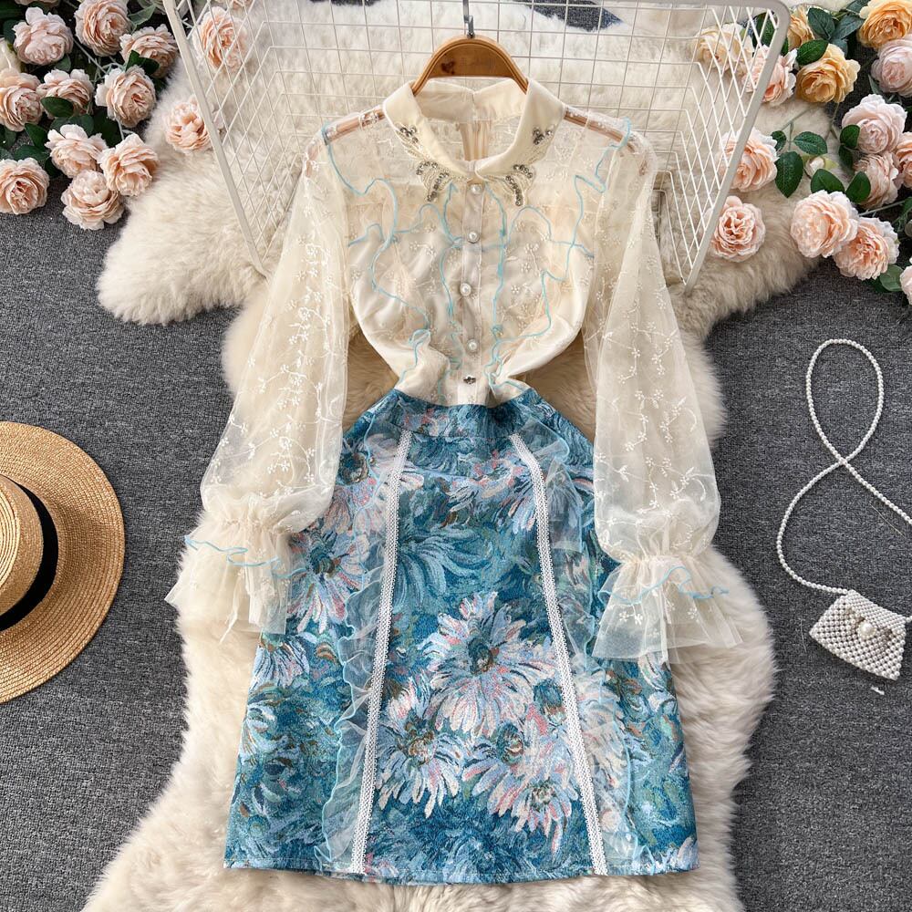 春と秋の新しい重工業メッシュ金糸刺繍ビーズ長袖スリムステッチ絞り染めプリントドレストレンディ ロング スプリング 春物 オータム 秋物 lyxaj14726198481