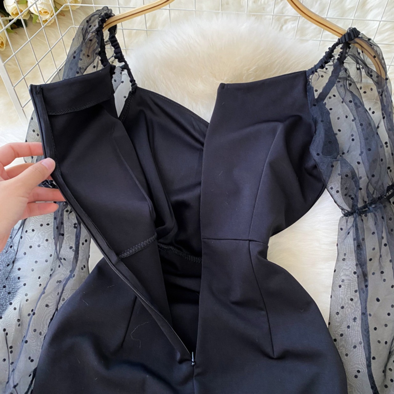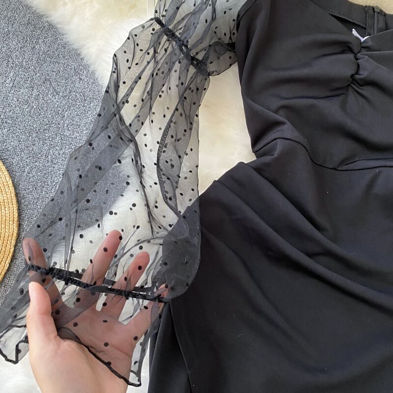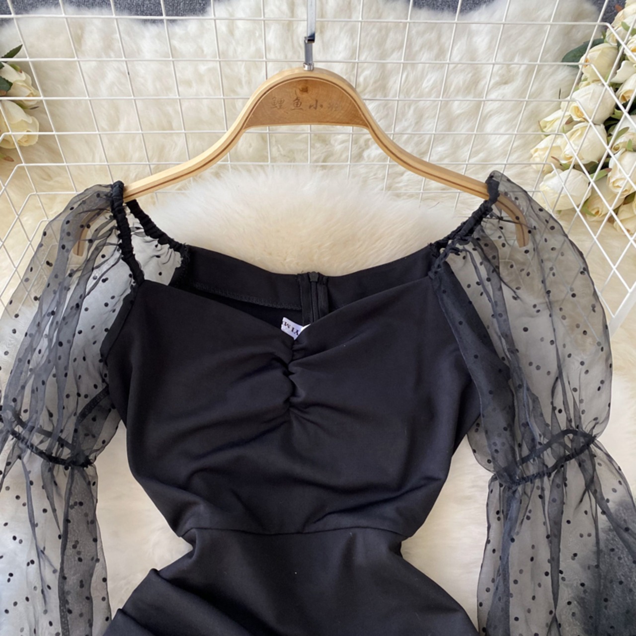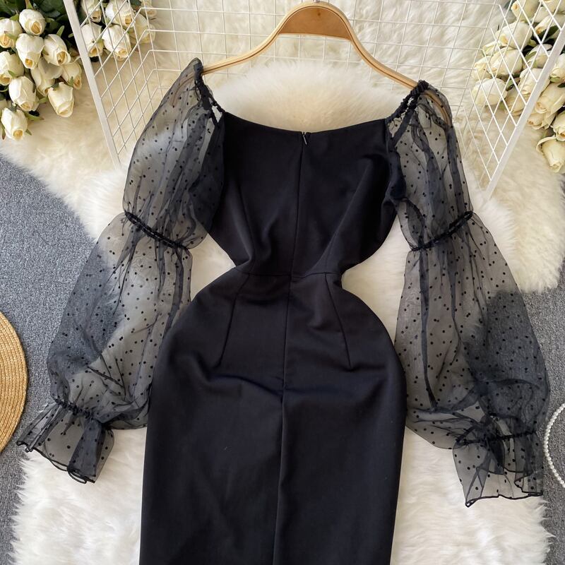 秋と冬の新しいセクシーな気質のソーシャライト メッシュ スプライシング一言スリムフィット バッグ ヒップ長袖ドレス ヘップバーン リトル ブラック ドレス ロング オータム 秋物 ウィンター 冬物 lyxaj22974081431