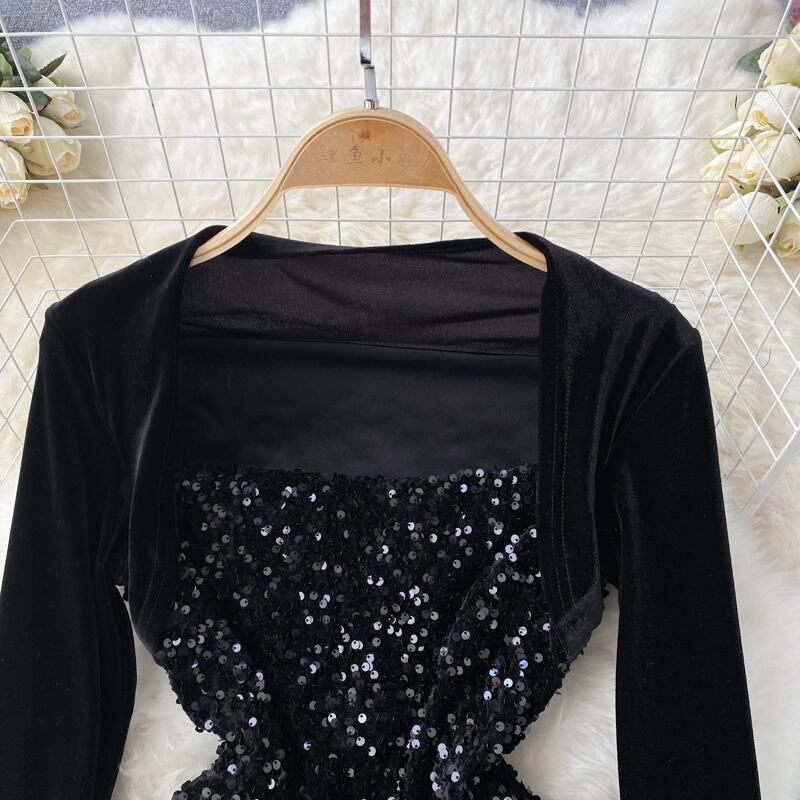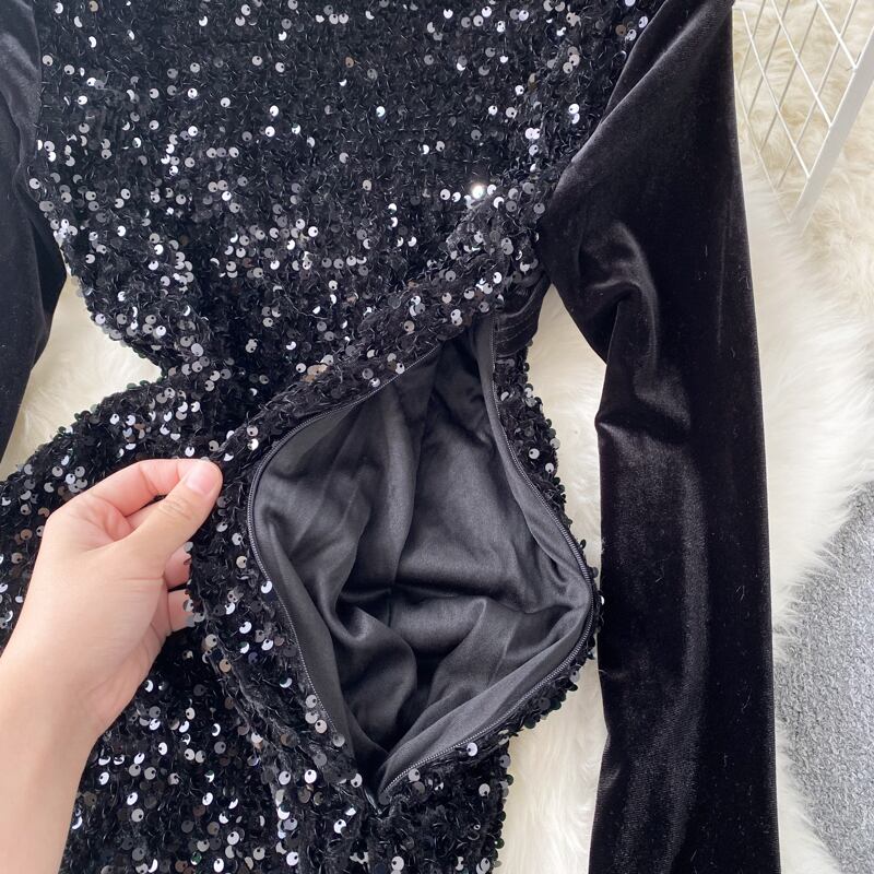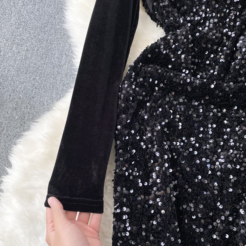 秋と冬のデザインセンスの新しい重工業ベルベットステッチスパンコールイブニングドレスドレスフェミニン気質バッグヒップスカート オータム 秋物 ウィンター 冬物 lyxaj49217973630