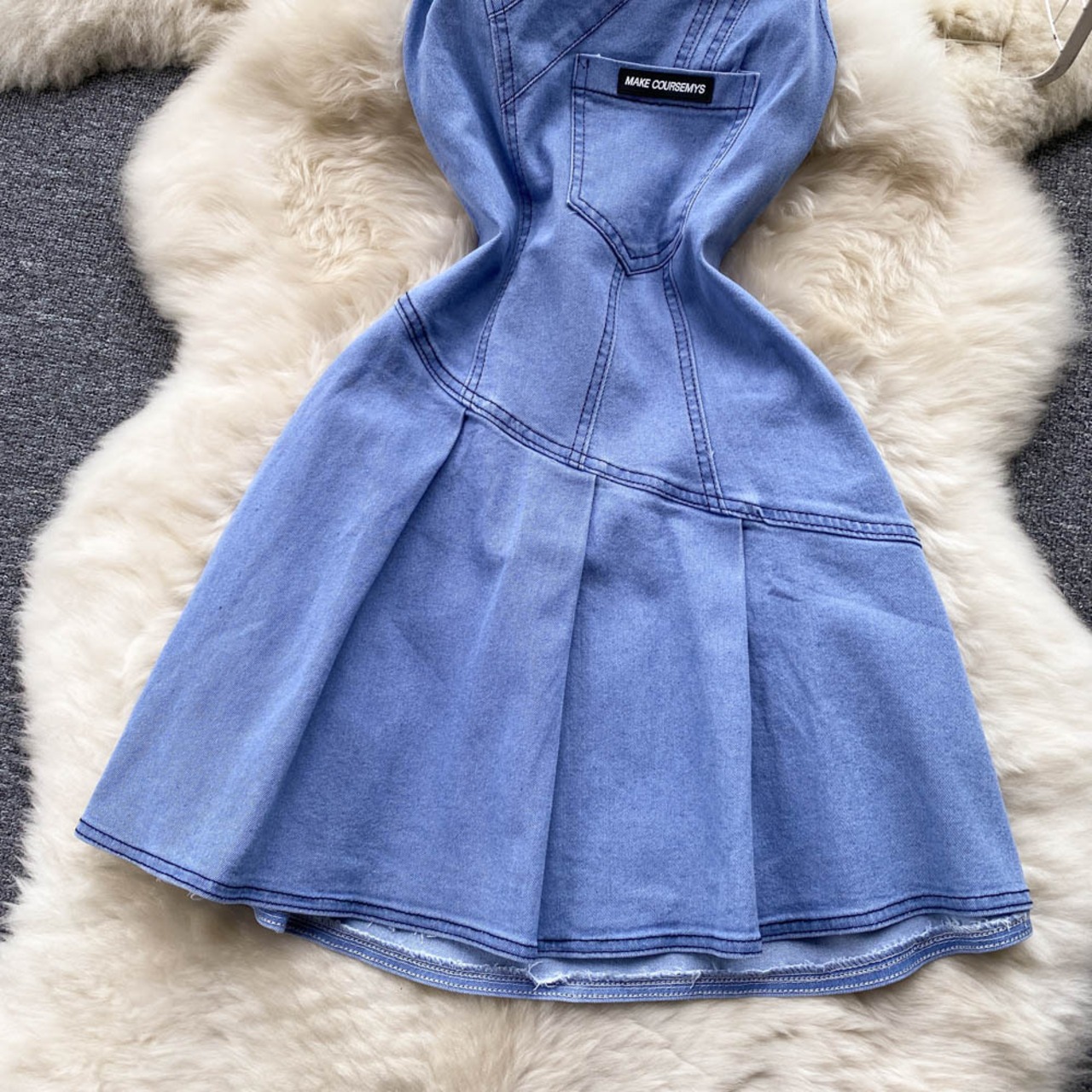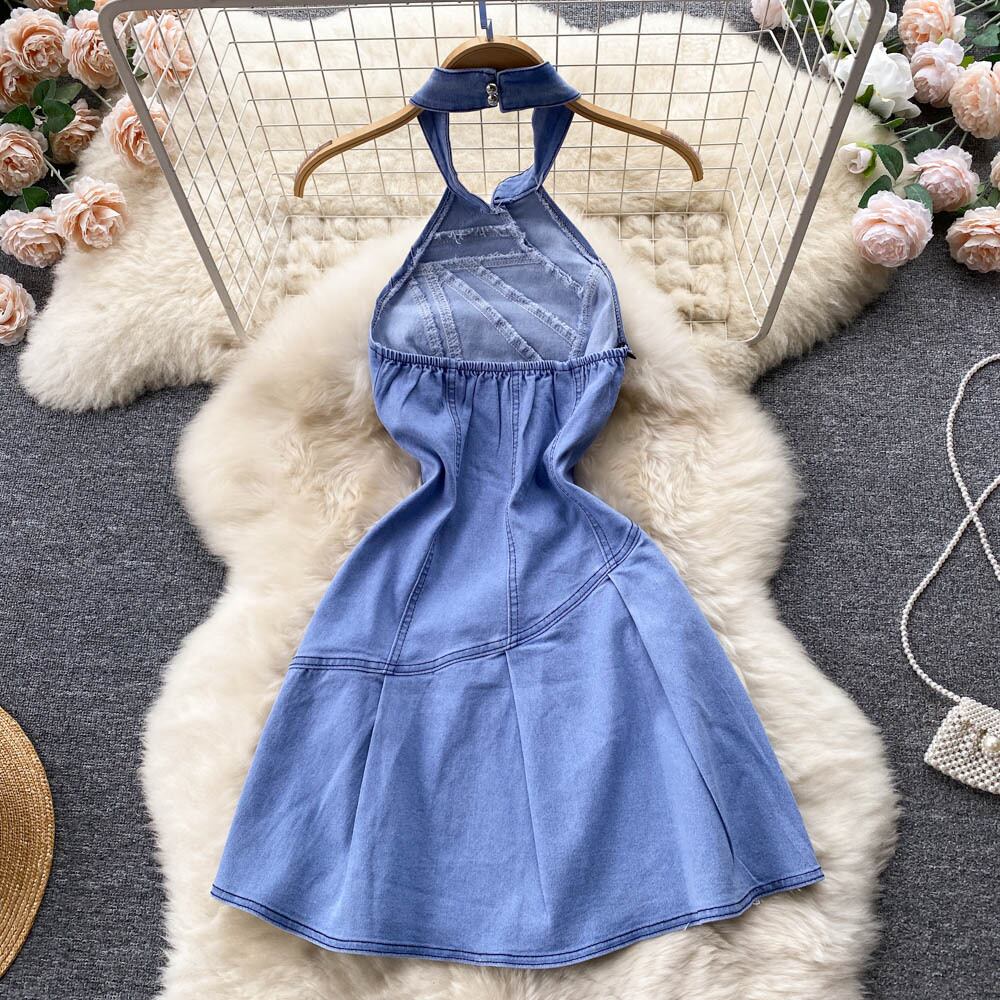 スパイスニッチデザインのセクシーなデニムホルターネックドレス気質 2022 新しい女性のウエスト痩身 A ラインスカート Aライン lyxaj32823721499
