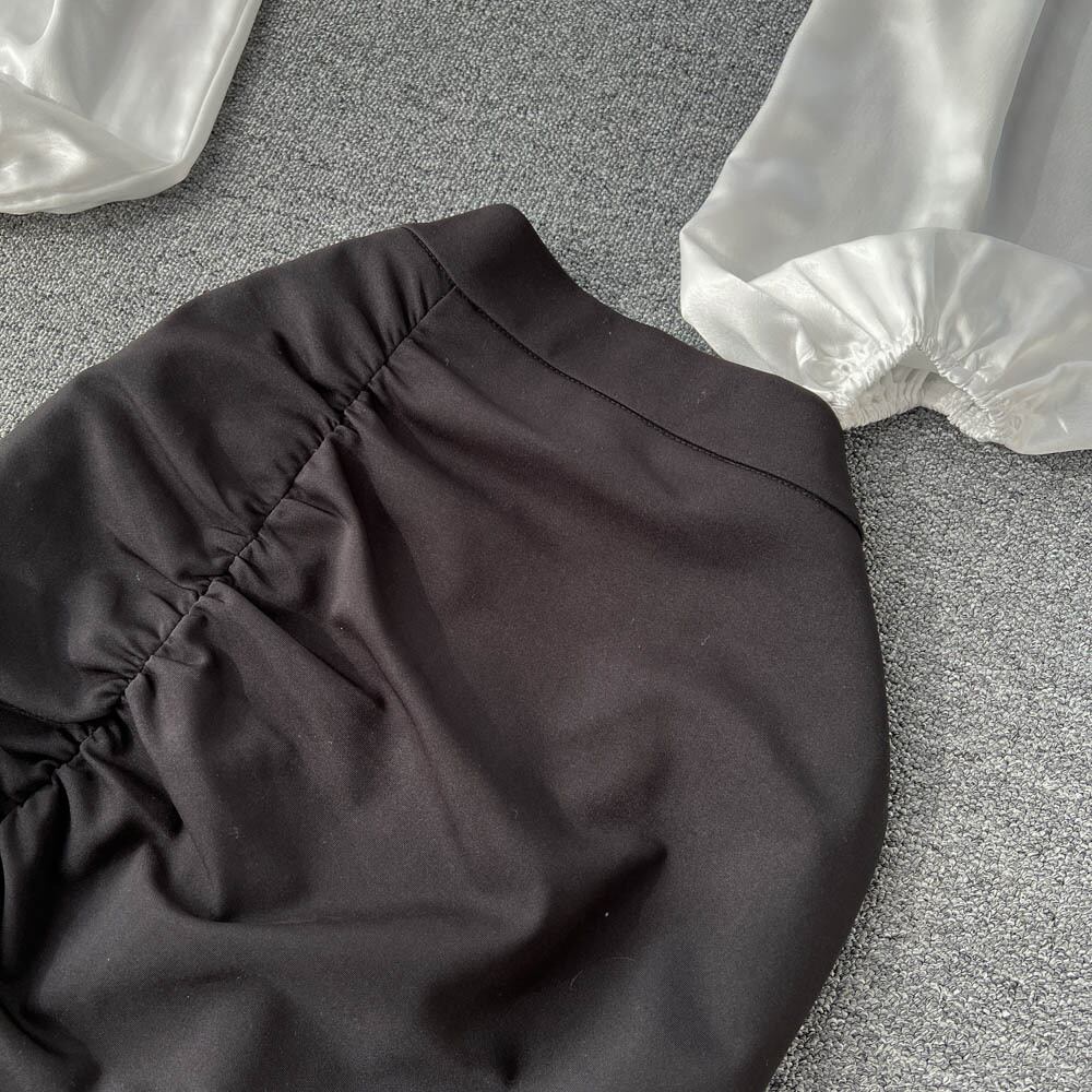 春秋フレンチレディスタイルスーツレディースパフスリーブVネックサテンシャツ+プリーツフィッシュテールスカート2点セット スプリング 春物 オータム 秋物 lyxaj81346376870