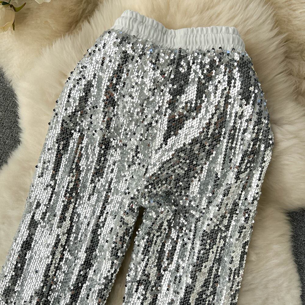 春と秋の新しいデザイン感覚のニッチ トレンディなレースアップ重工業スパンコール カジュアル ドレープ ワイドレッグ ブラック ストレート パンツ女性 スプリング 春物 オータム 秋物 lyxaj49386918347