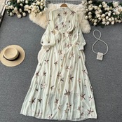 秋のパフスリーブシフォンドレスレディースフレンチスタイル花刺繍スリム優しい風甘い妖精ロングドレス 大人ガーリー スウィート キュート カジュアル オータム 秋物 花柄 lyxaj30280935223