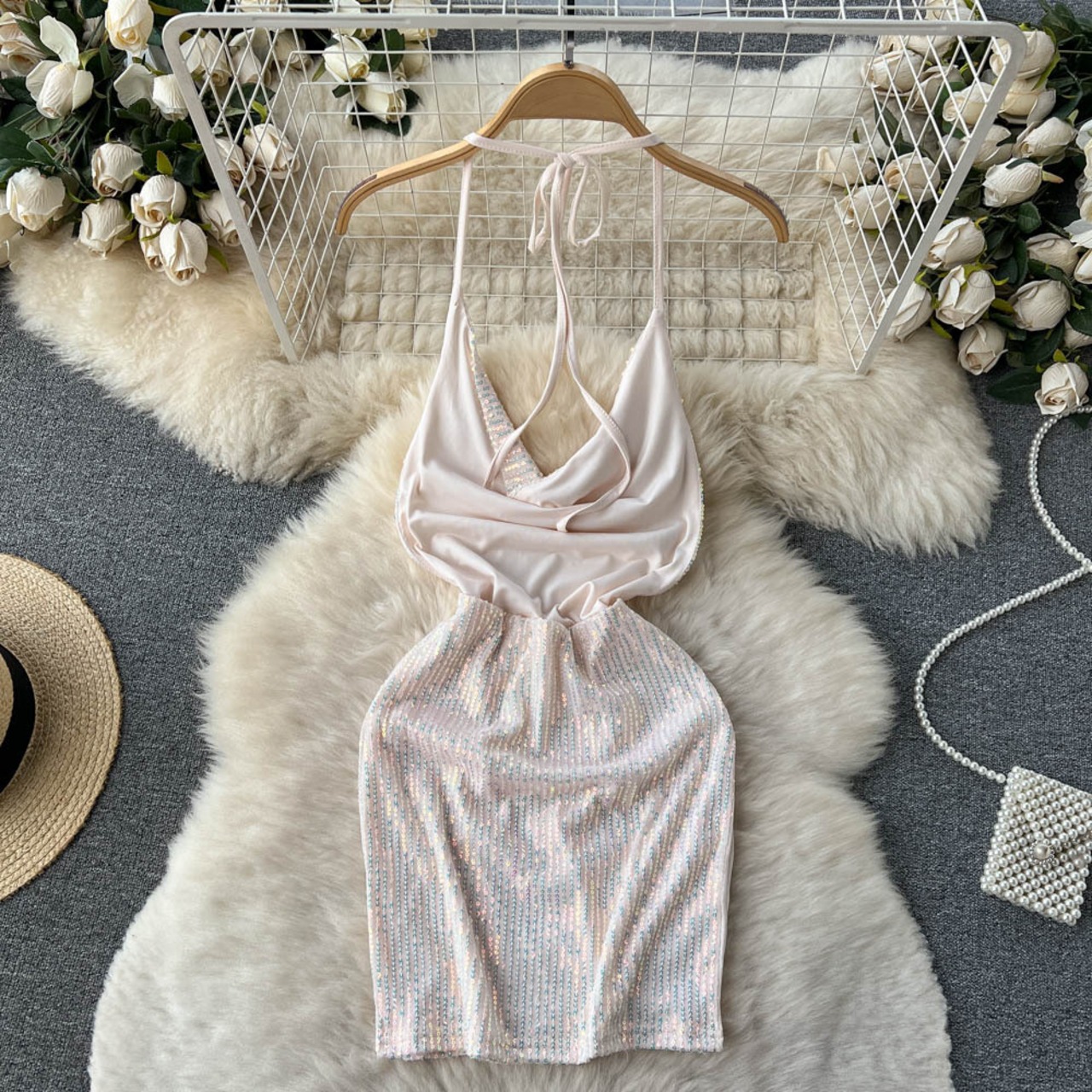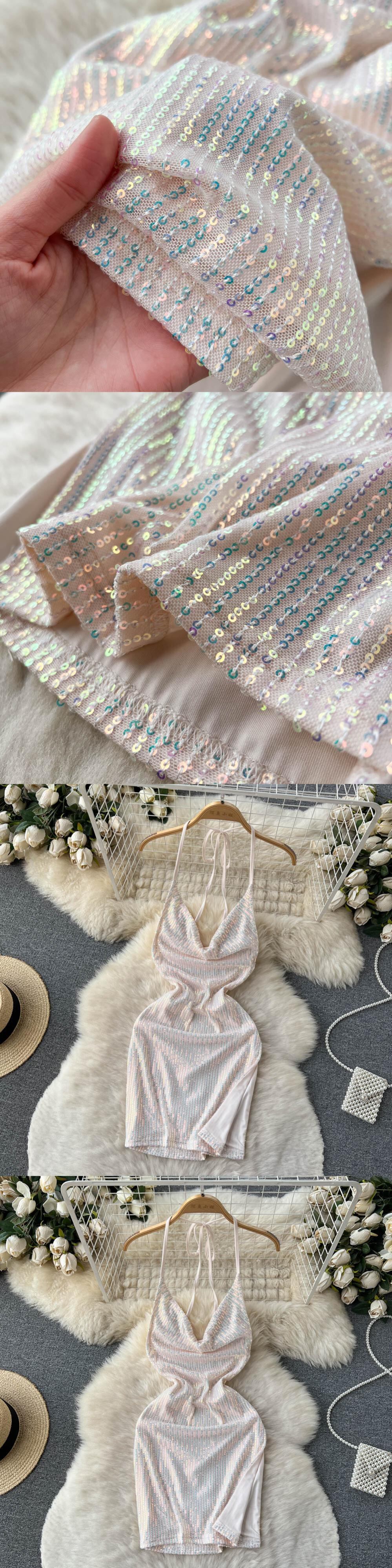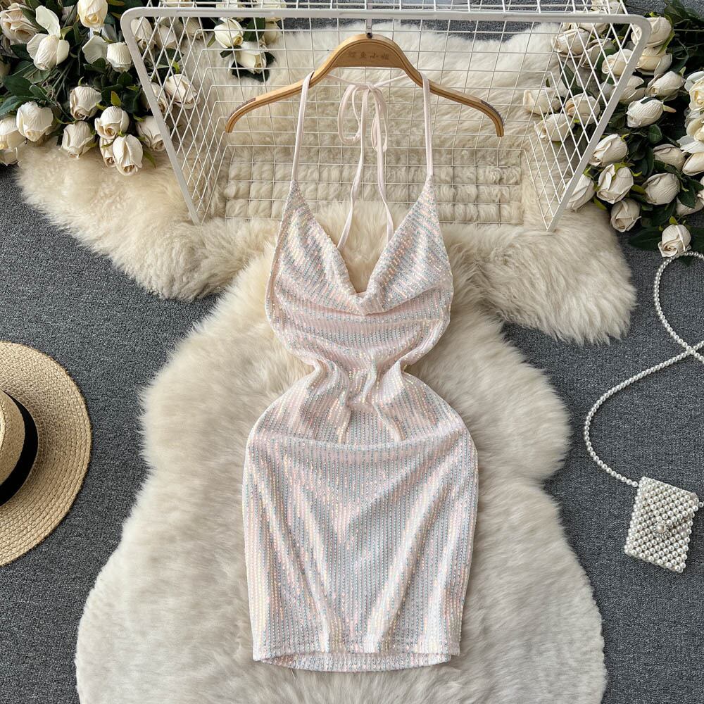 ダーク スタイル デザイン センス スパンコール レトロ ジャカード ドレス レディース ホルター ネック タイ セクシー セレブ バッグ ヒップ イブニング ドレス スカート lyxaj26254194726