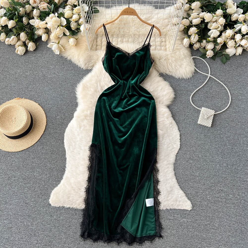 秋と冬の新しい純粋な欲望風レース ステッチ スリング ドレス女性ウエスト セクシーなセレブ スリット ロング スカート オータム 秋物 ウィンター 冬物 ピュア lyxaj9445329331