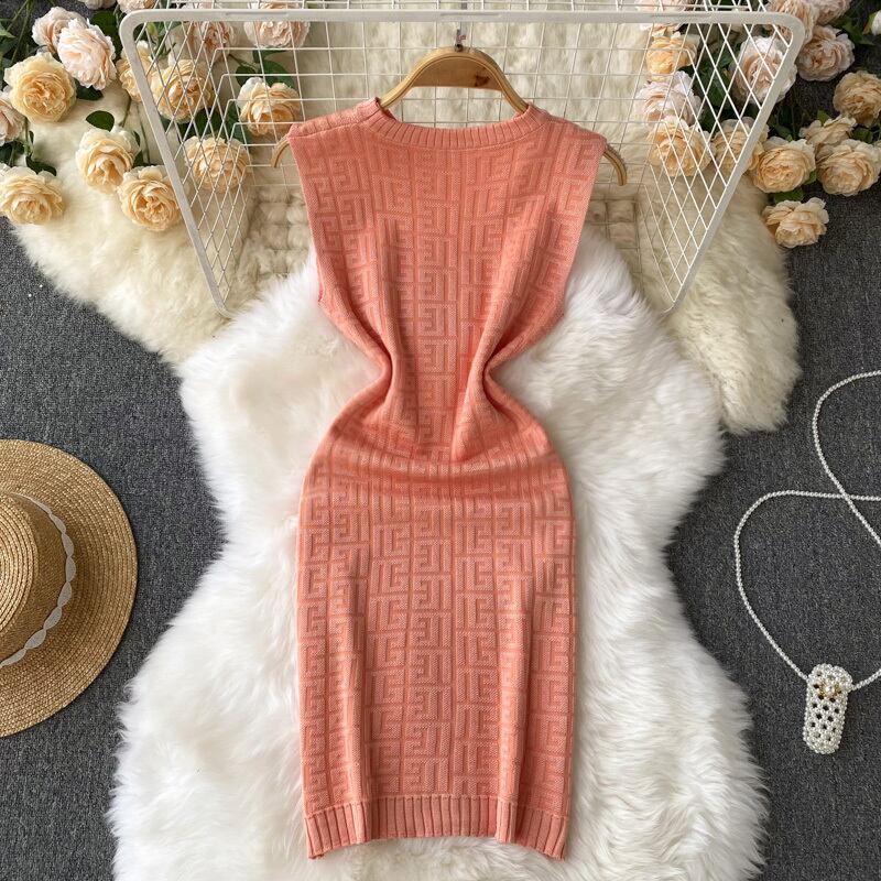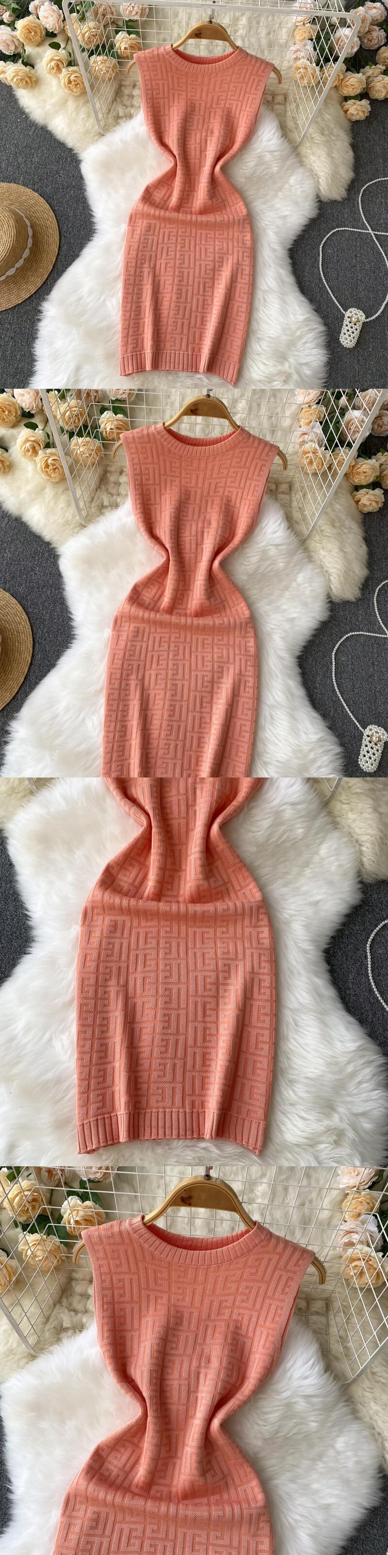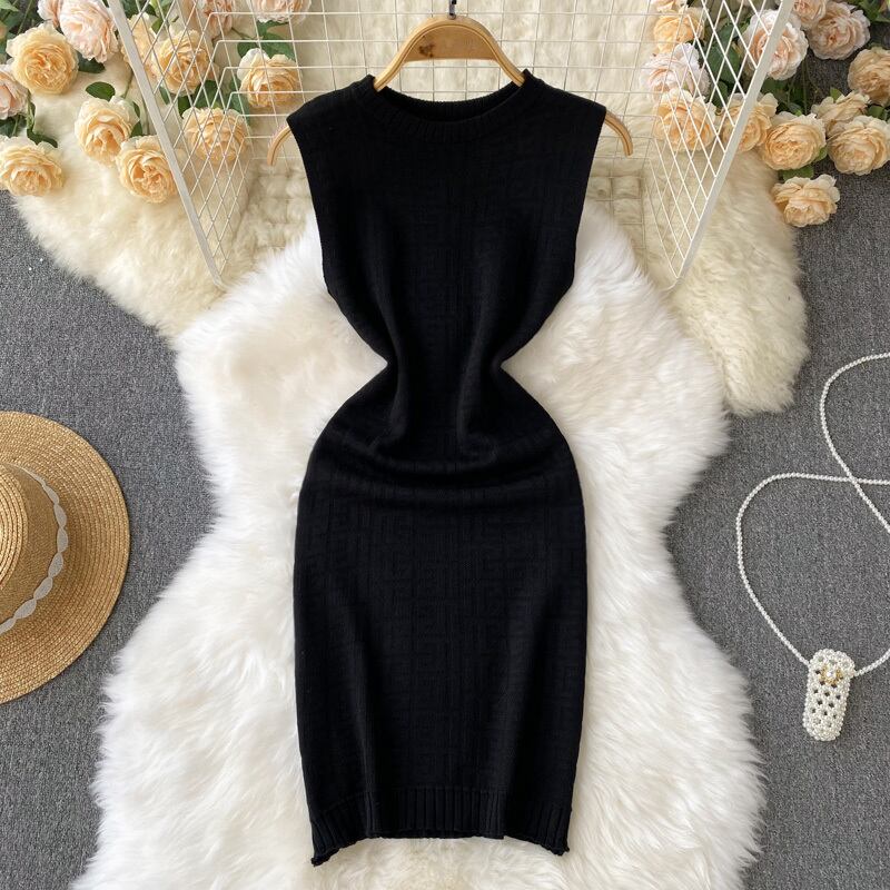 優しい風ラウンドネックノースリーブオフショルダーニットドレス女性の2022年夏の新しいスリムフィットと薄い底入れバッグヒップスカート サマー 夏物 Oネック lyxaj28094782147