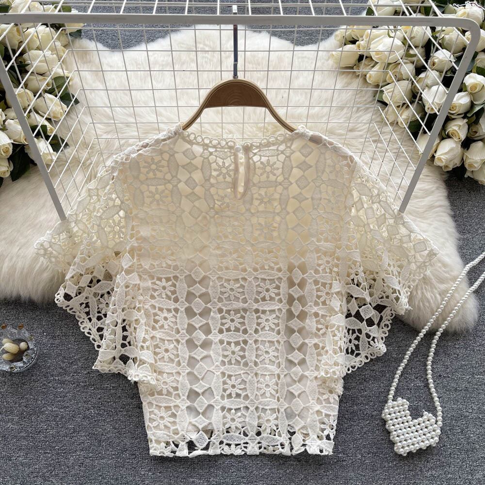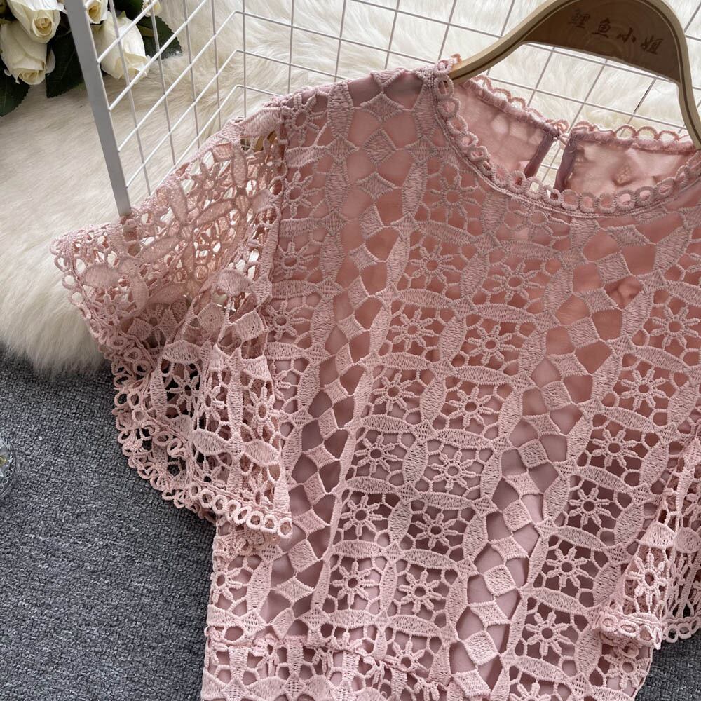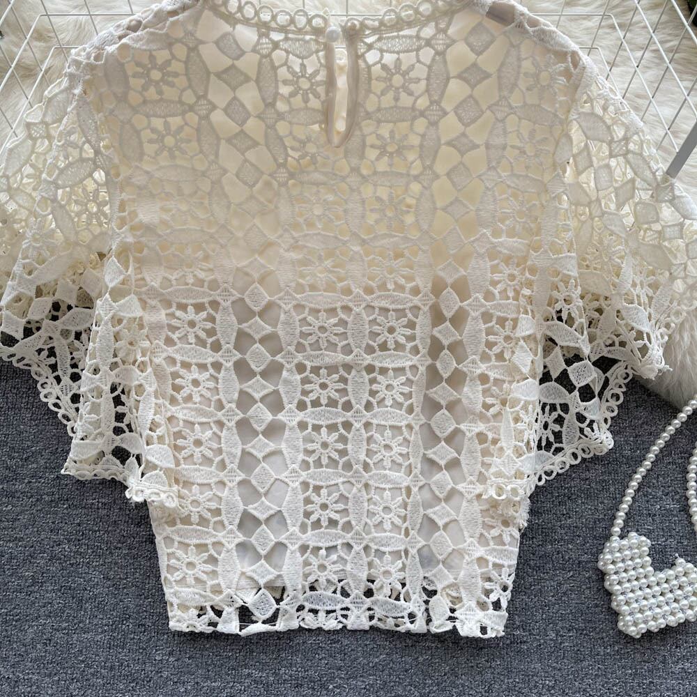 フランスのレトロなチェーン リンク花中空ショート レース ブラウス eign スタイル トップ女性の半袖プルオーバー eign スタイル シックな人形シャツ フラワーデザイン lyxaj11983544607