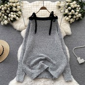 2022 秋と冬の新デザインセンスカラーコントラストスプライシング巾着ネクタイストラップ一言襟ストラップレス怠惰な緩いセーターの女性 オータム 秋物 ウィンター 冬物 lyxaj2583916190