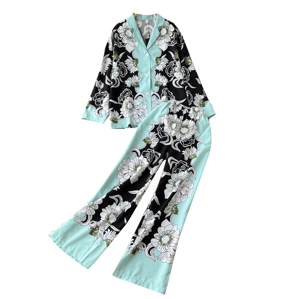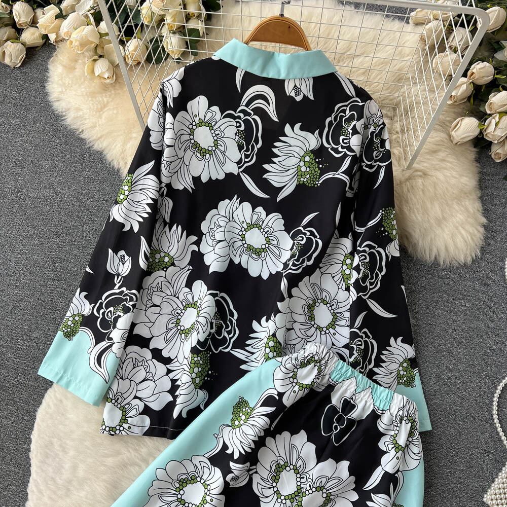 ヨーロッパ駅ファッションレトロプリント長袖スーツ女性の秋の新ラペルシャツワイドレッグパンツツーピーストレンディ ロング オータム 秋物 ヨーロピアン lyxaj44855031228