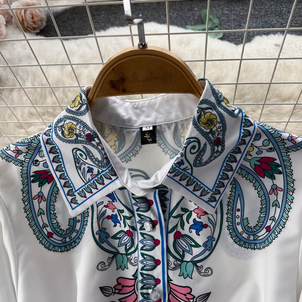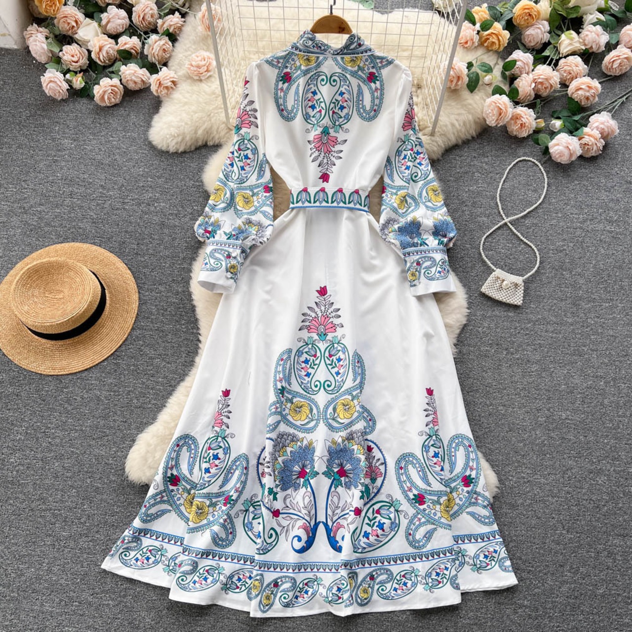エスニック風プリント長袖ハイウエストスリムAラインドレスレディース春秋シングルブレスト大スイングラペルロングスカート スプリング 春物 オータム 秋物 lyxaj28761839411