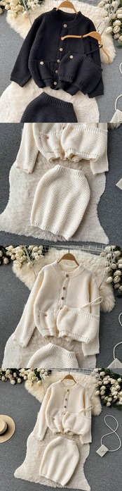 ・エンドスーツ メタルバックルニットセーターカーディガンジャケット+ショートホルターネックチューブトップ+ヒップスカートの3点セット lyxaj78408639666