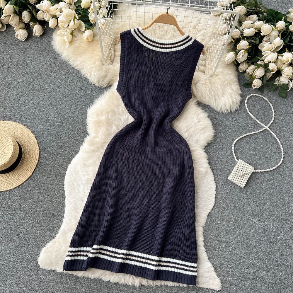 レイジー カレッジ スタイル オーバー ザ ニー ツイスト セーター プルオーバー レディース バージョン V ネック ルーズ コントラスト カラー ストライプ ニット ドレス Vネック lyxaj42003900599