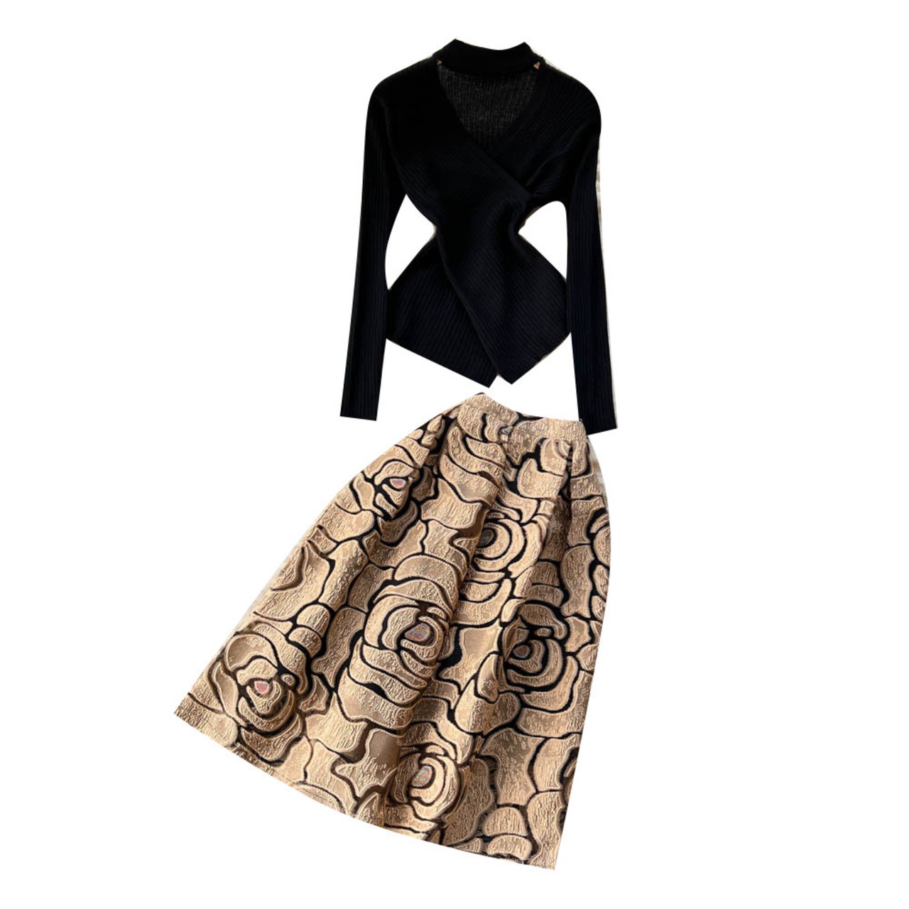 春秋フレンチレトロクロスVネックイレギュラーニット+プリント大振りAラインスカートツーピーススーツトレンド スプリング 春物 オータム 秋物 lyxaj41114259688