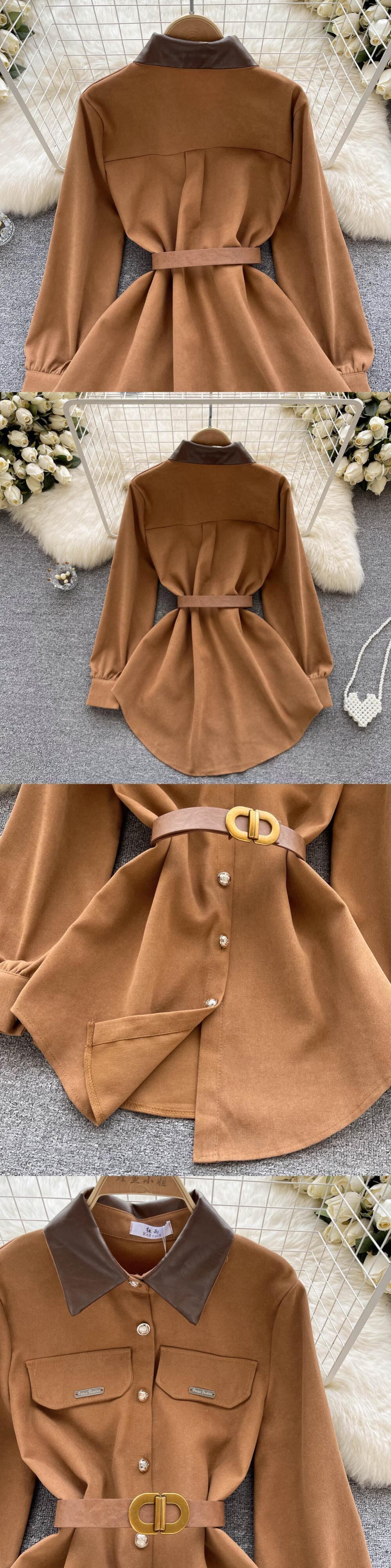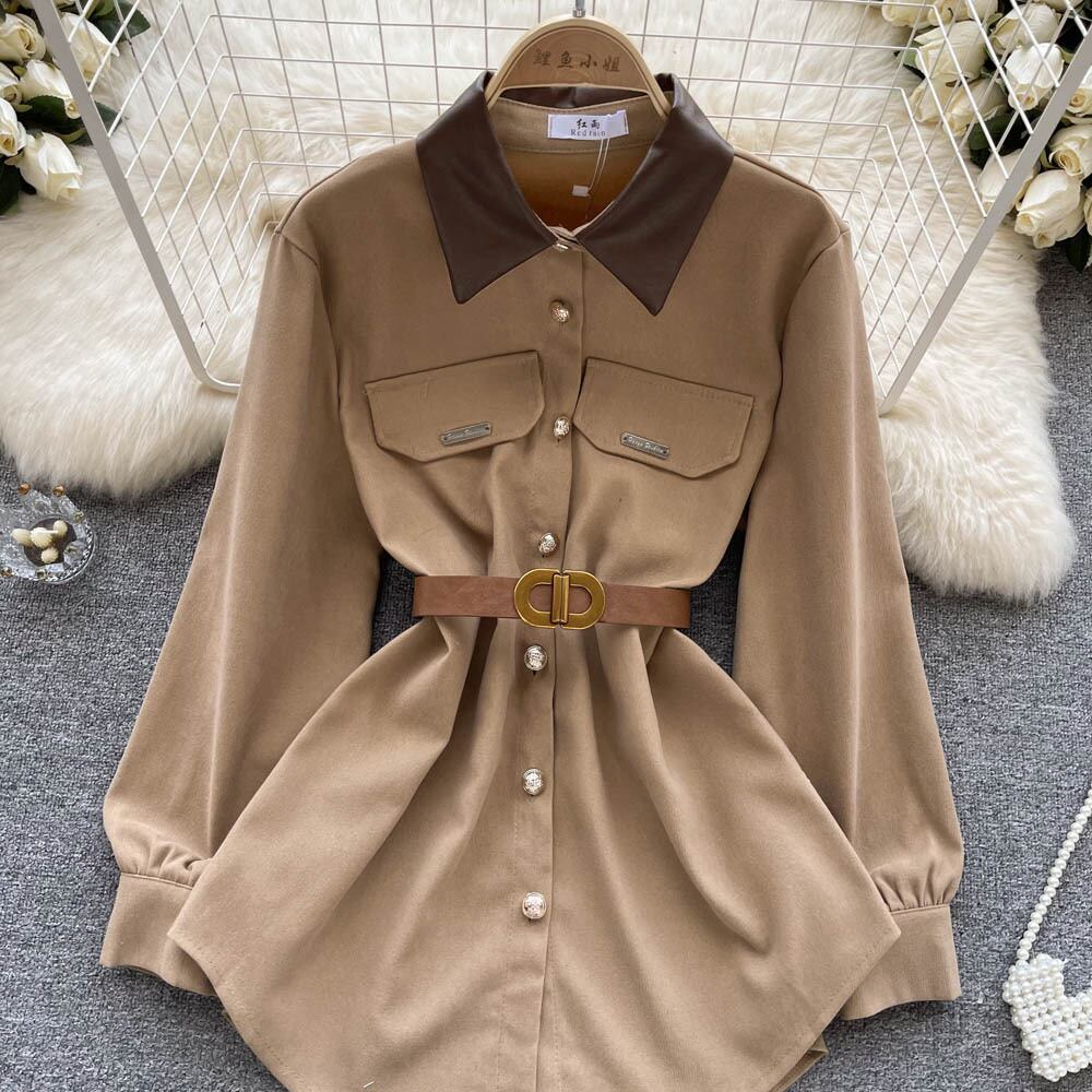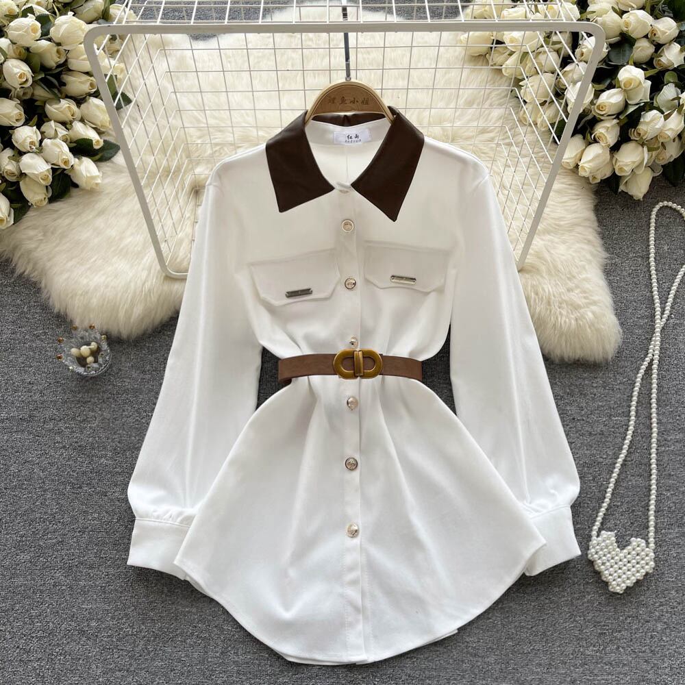 2022 秋と冬のポロ襟新しいヘップバーンスタイルのデザインセンスウエストウエスト気質長袖ミッドレングス怠惰なルーズシャツ女性 ロング オータム 秋物 ウィンター 冬物 lyxaj20365500782