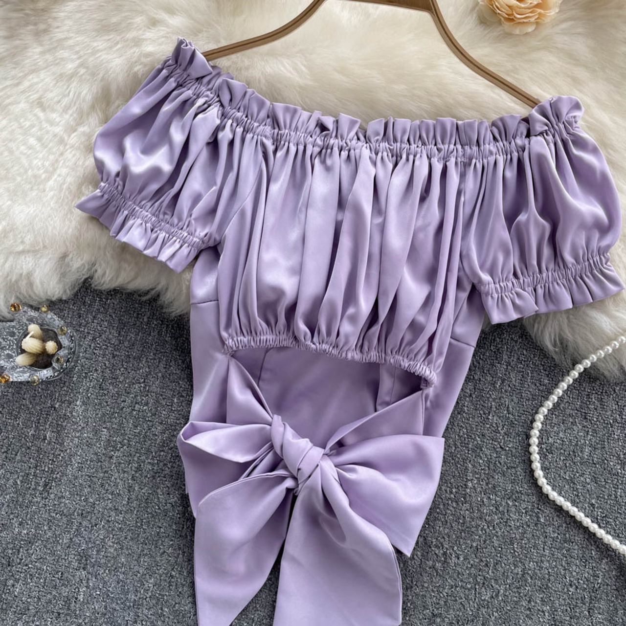 甘いちょう結び年齢を減らすきのこサイドオフショルダー半袖シャツレディースデザインセンスニッチスリムフィット気質ショートトップ リボン 大人ガーリー スウィート キュート カジュアル lyxaj63030469372