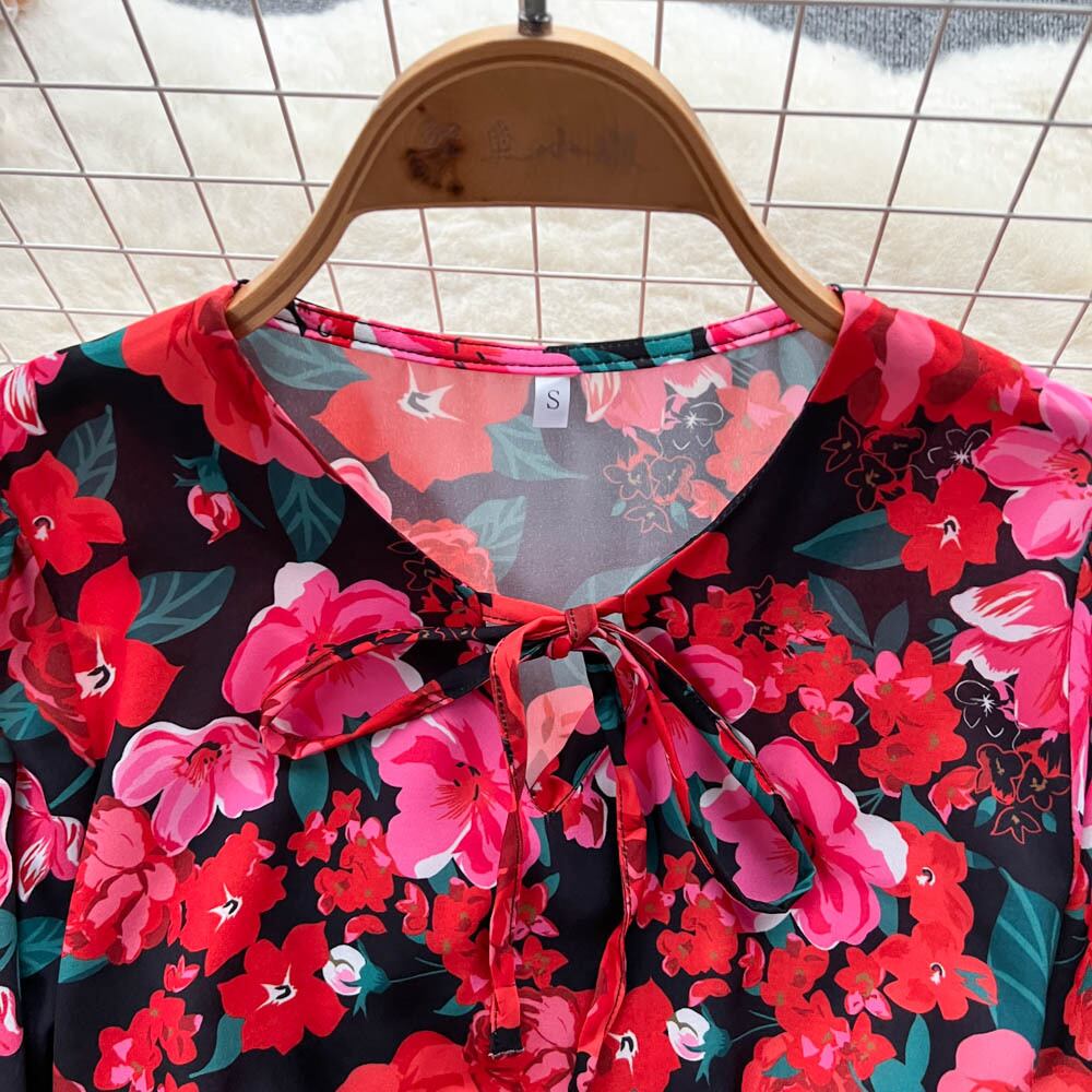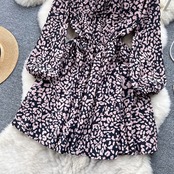 春パフスリーブ弾性ウエストスリムプリントドレス女性の多彩なフレンチ A ラインロングスカートトレンディ エラスティック 伸縮 スプリング 春物 Aライン lyxaj82031478235