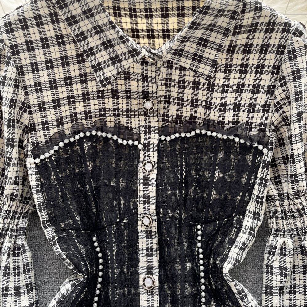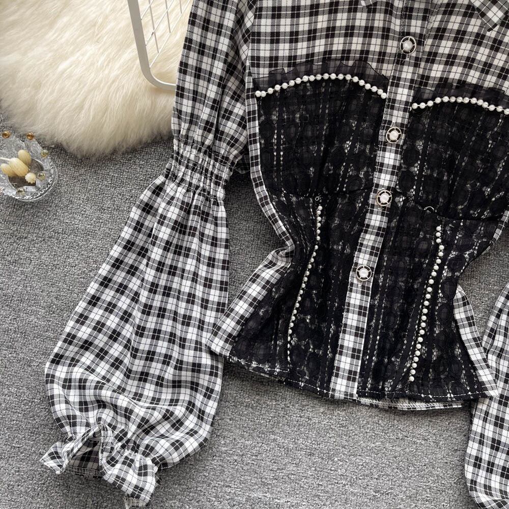 フランスのニッチなデザインセンスレースステッチチェック柄パフスリーブシャツトップ秋レディースウエストウエストオールマッチシャツ潮 オータム 秋物 lyxaj99697980717