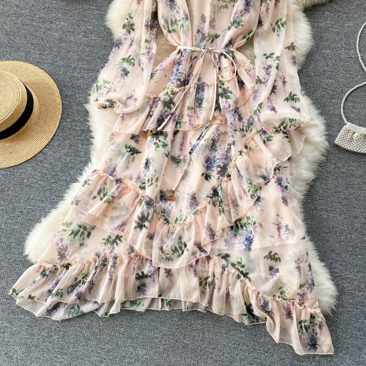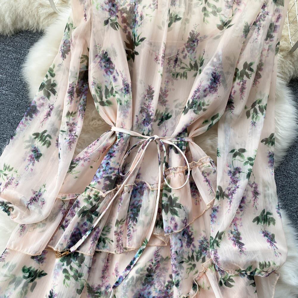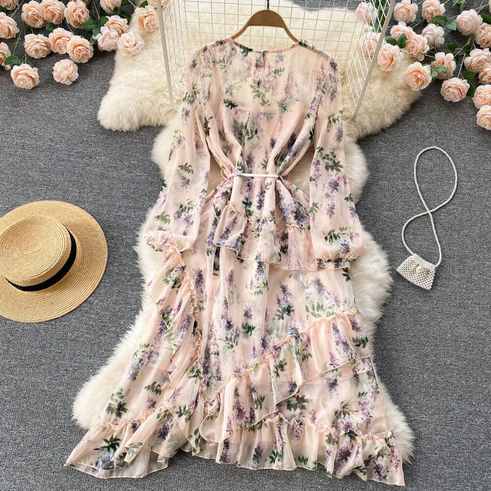シックなスタイルの秋のプリーツ花柄 V ネック レトロな底入れスカート気質ウエスト フレンチ ニッチ ドレス女性 オータム 秋物 Vネック lyxaj59987415824