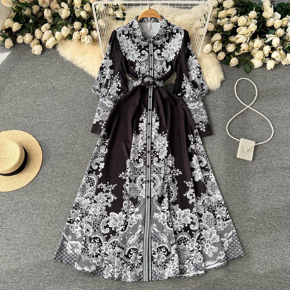 春と秋のデザインセンスのニッチな宮殿スタイルのレトロなプリントラペルパフスリーブウエストスリムドレスヨーロッパとアメリカのロングスカート レース スプリング 春物 オータム 秋物 ヨーロピアン lyxaj38924269189