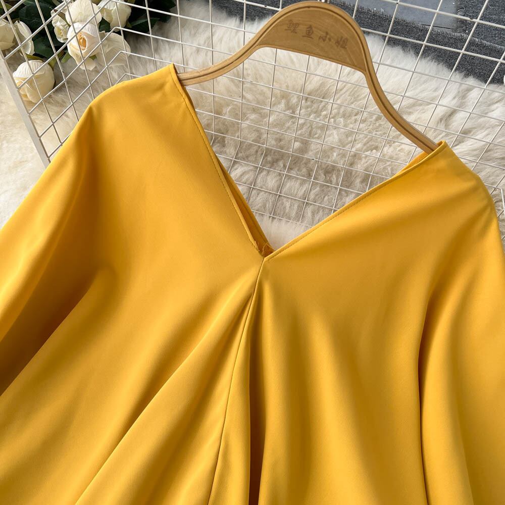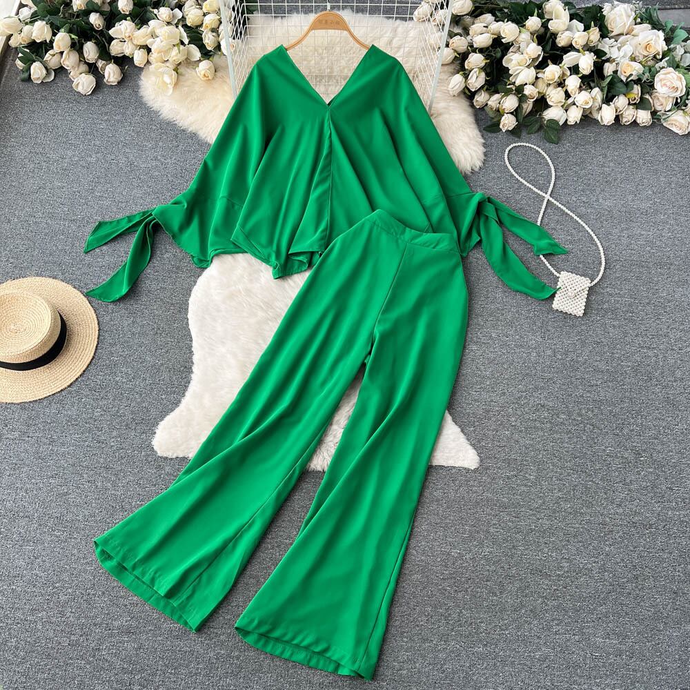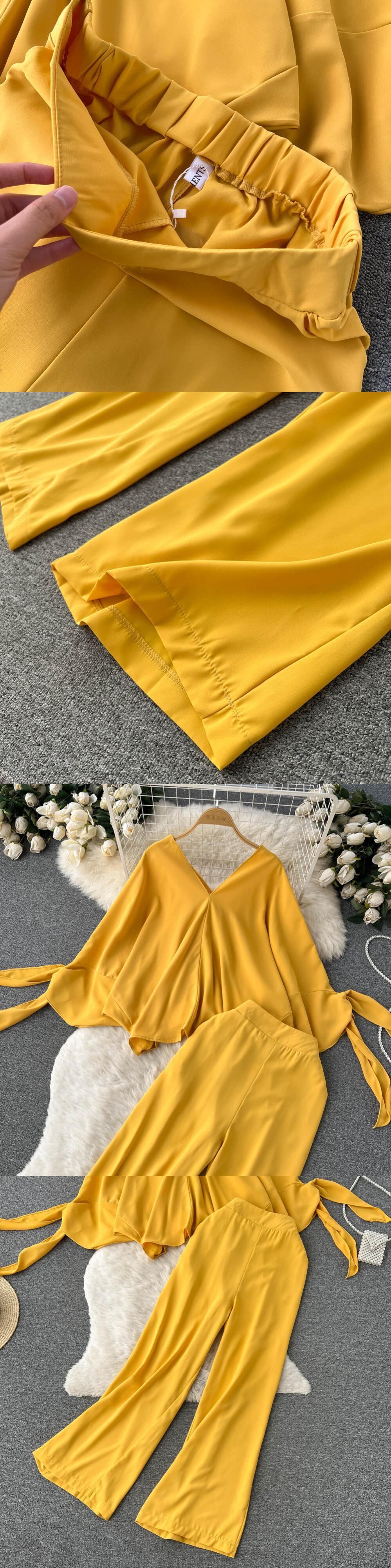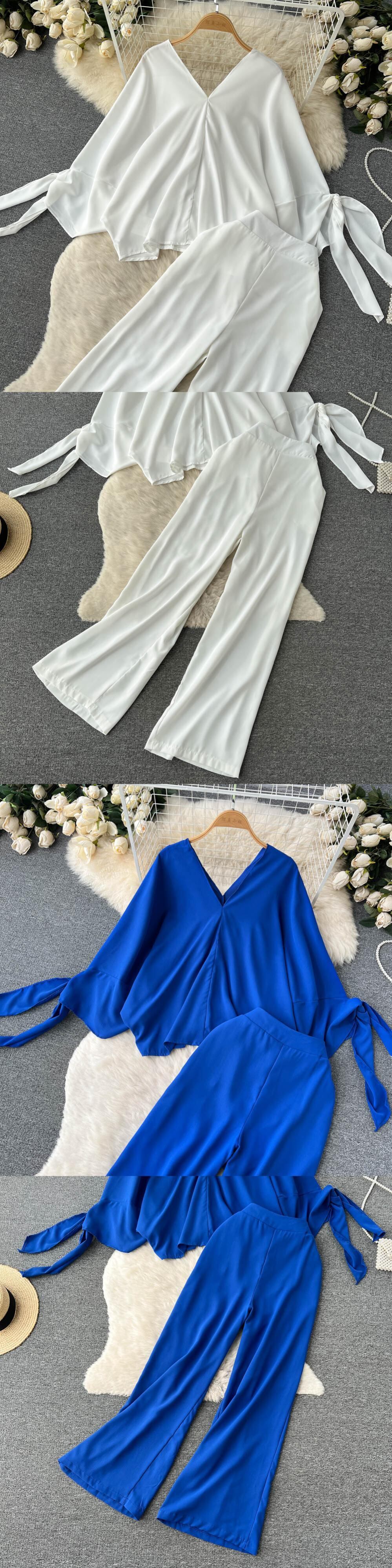 秋の気質の軽やかで親しみやすいスタイルのスーツの女性の計画的なVネックのデザインルーズトップ+ドレープワイドレッグパンツの2点セット オータム 秋物 lyxaj11184141474